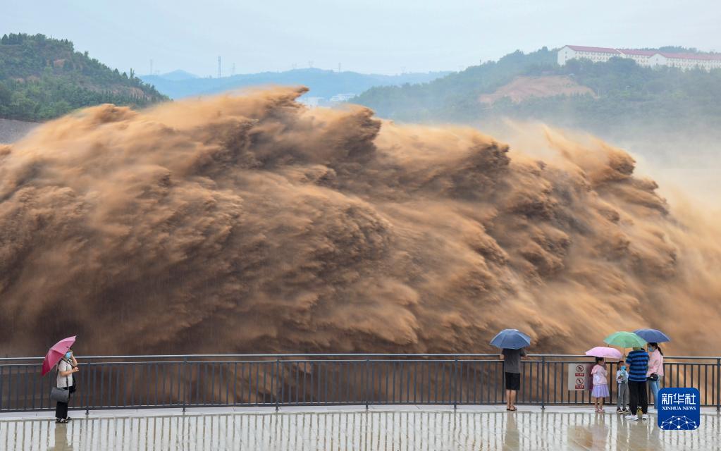 7月19日,游客观看黄河小浪底水库大流量泄洪。