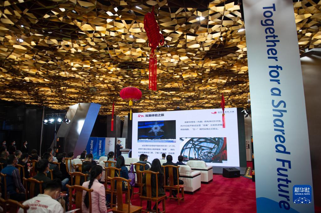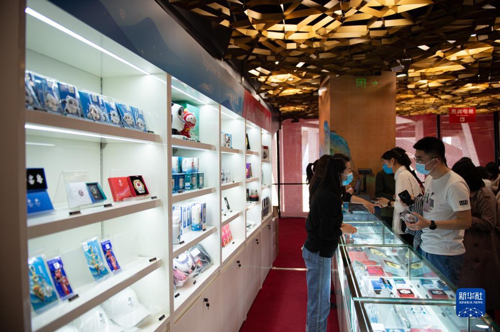 4月20日,“双奥”主题旅游线路体验者在场馆内购买文创产品。新华社记者 陈钟昊 摄