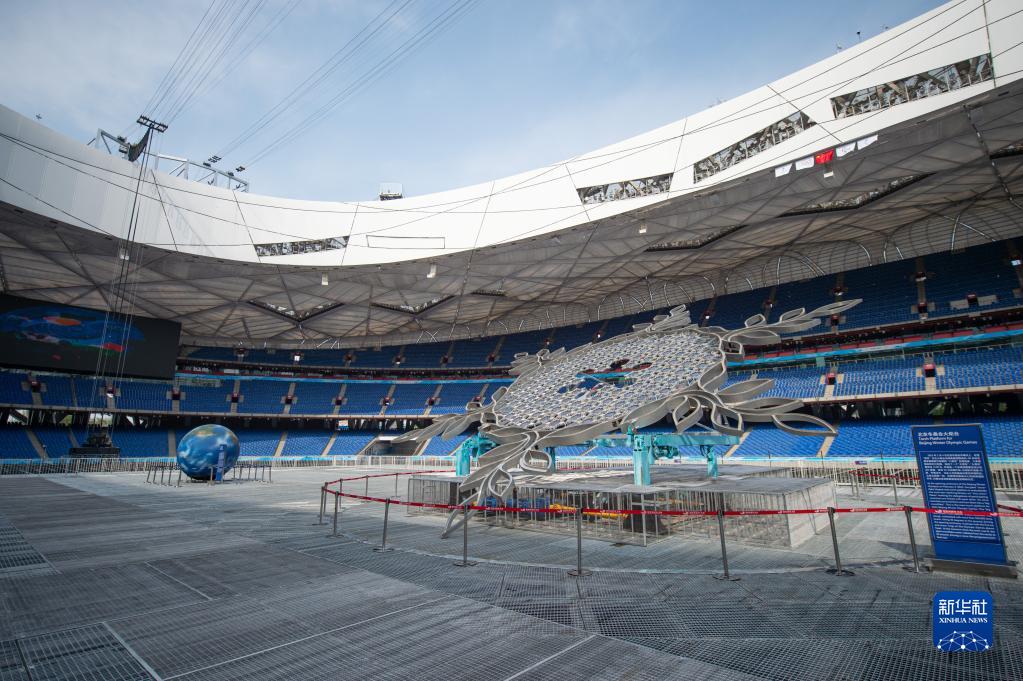 这是4月20日拍摄的位于“鸟巢”主场地舞台区的北京冬奥会“大雪花”主火炬。新华社记者 陈钟昊 摄