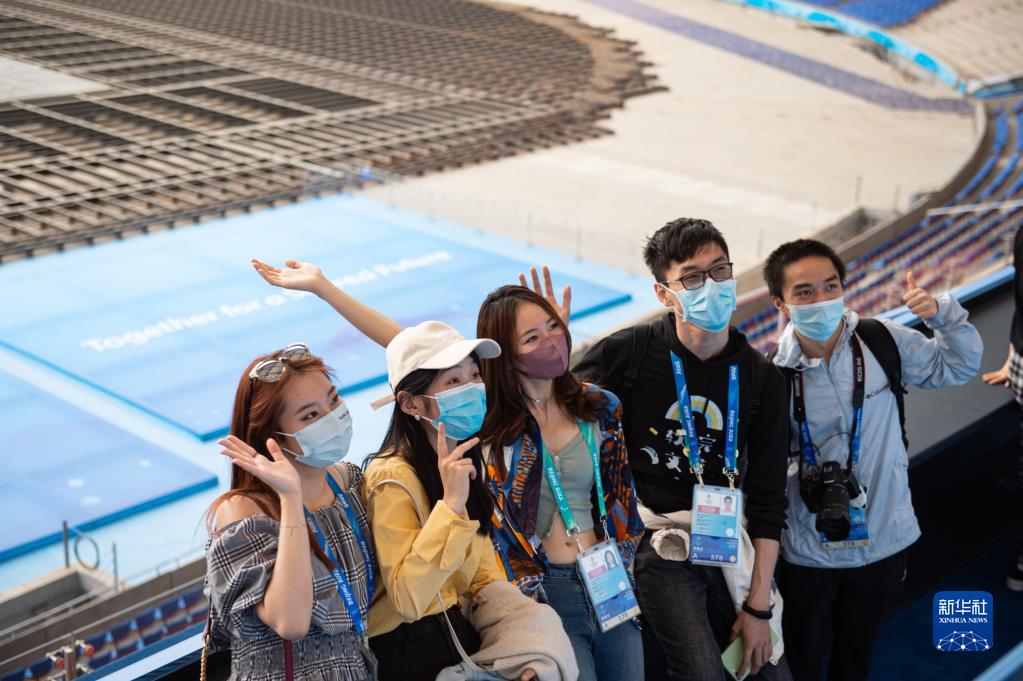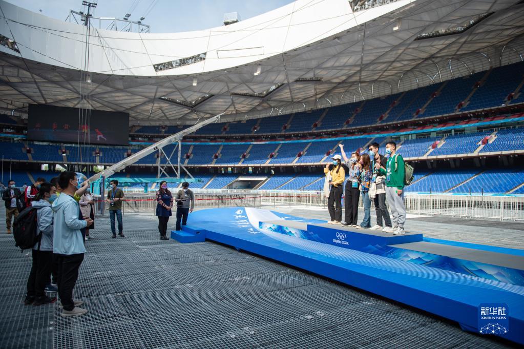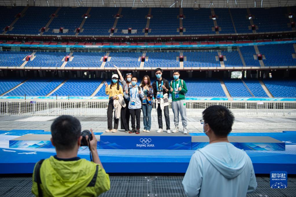 4月20日,受邀体验“双奥”主题旅游线路的北京冬奥会开闭幕式志愿者在主席台区域留影。新华社记者 陈钟昊 摄
