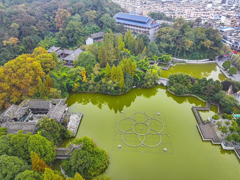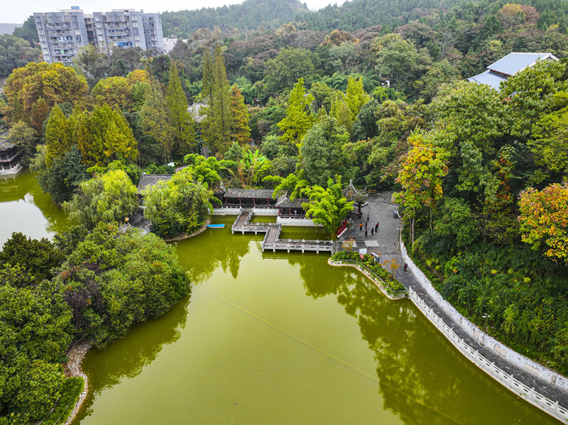 初冬时节,贵州省黔西市文峰街道水西公园层林尽染,色彩斑斓,小家碧玉的湖泊与古建筑相映成趣,为生态公园呈现出别样风景。