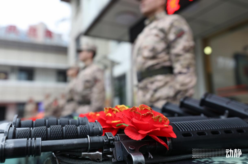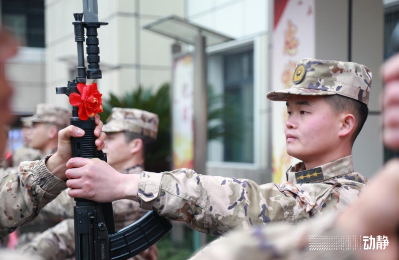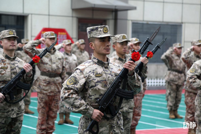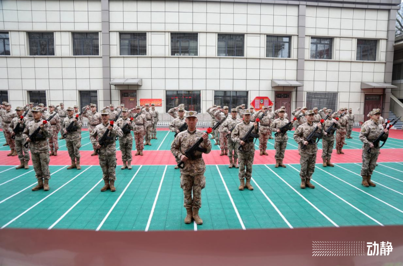 在宣读授枪命令后,新战士接过象征军人“第二生命”的钢枪,面向军旗,许下忠诚诺言。