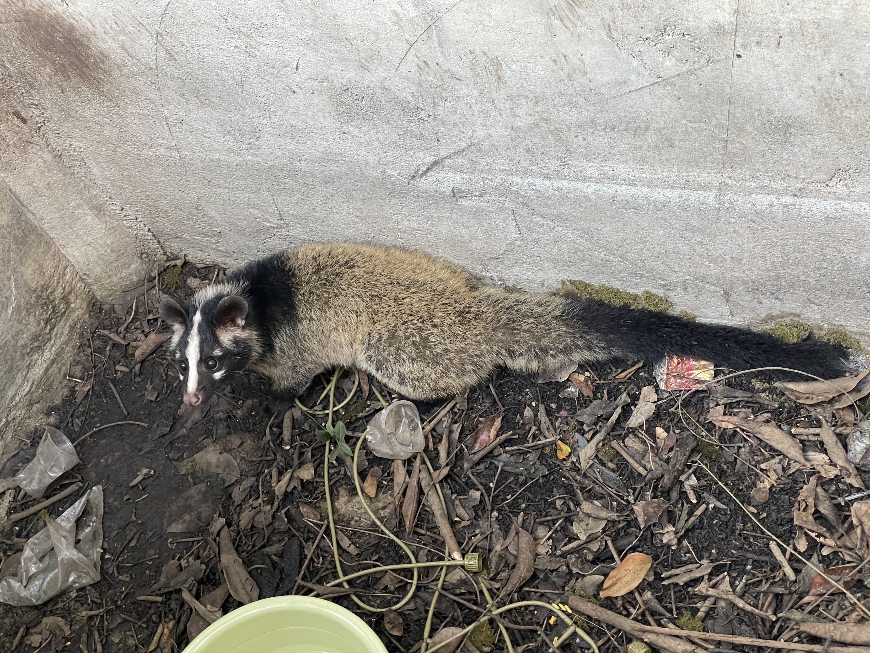 消防救援人员到场后,发现“小家伙”藏匿在废旧的水池角落中,身形和猫一般大小,前额有一条中央纵纹,眼上有清晰的白斑,眼下有一小块白灰色眼斑。