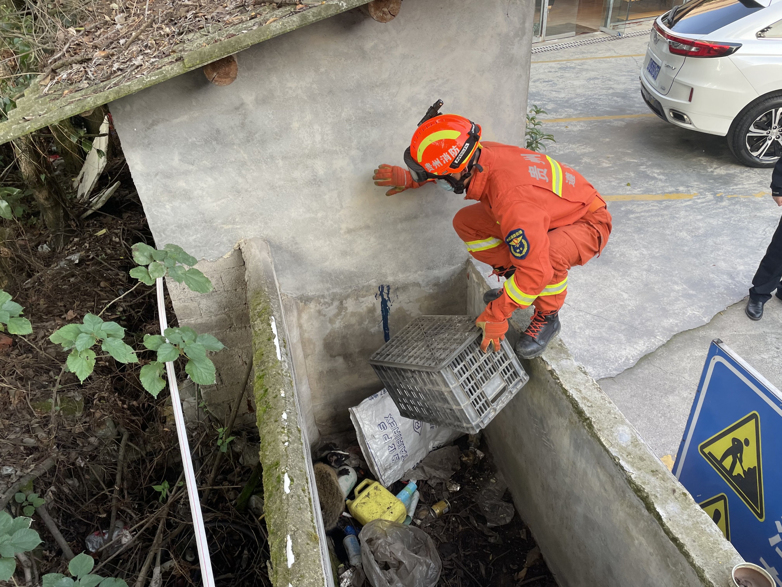 据报警人介绍,上班途中突然听见路旁传出特别尖锐的声音,查看发现是一只小动物在里面,为防止它逃窜伤人,便拨打119报警求助。