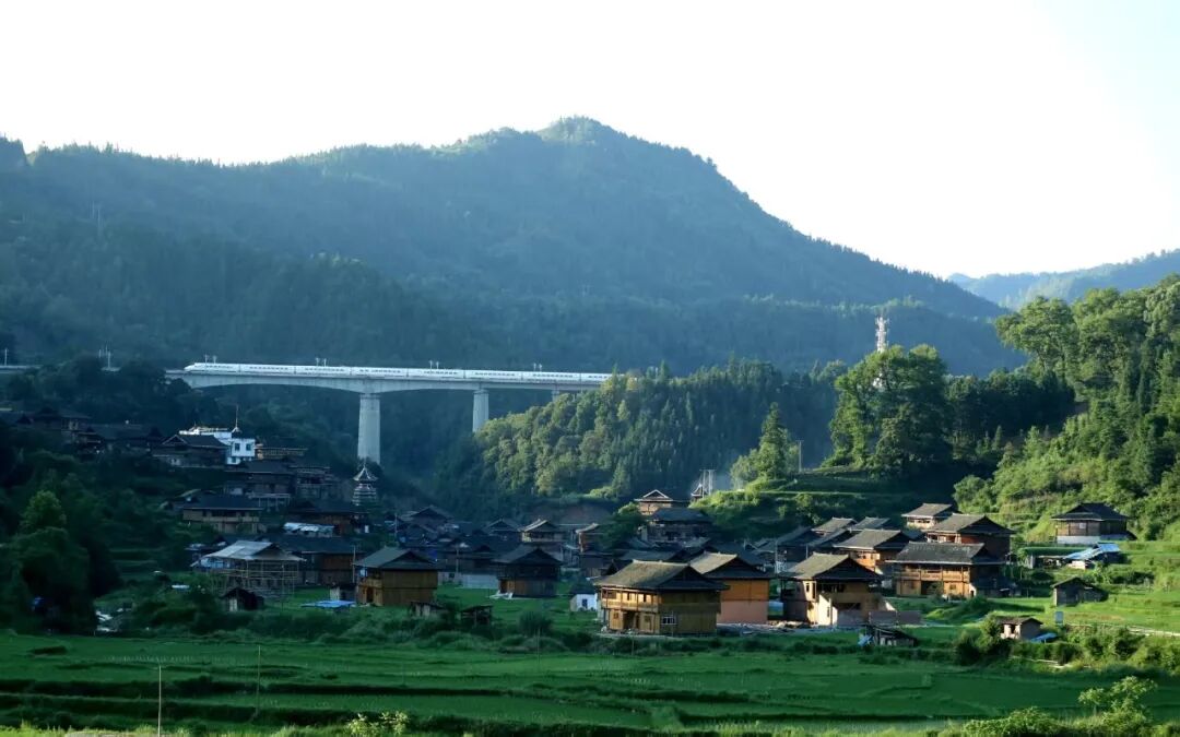 贵广高铁动车组穿过从江县往洞镇朝利侗寨(陆进平 摄)