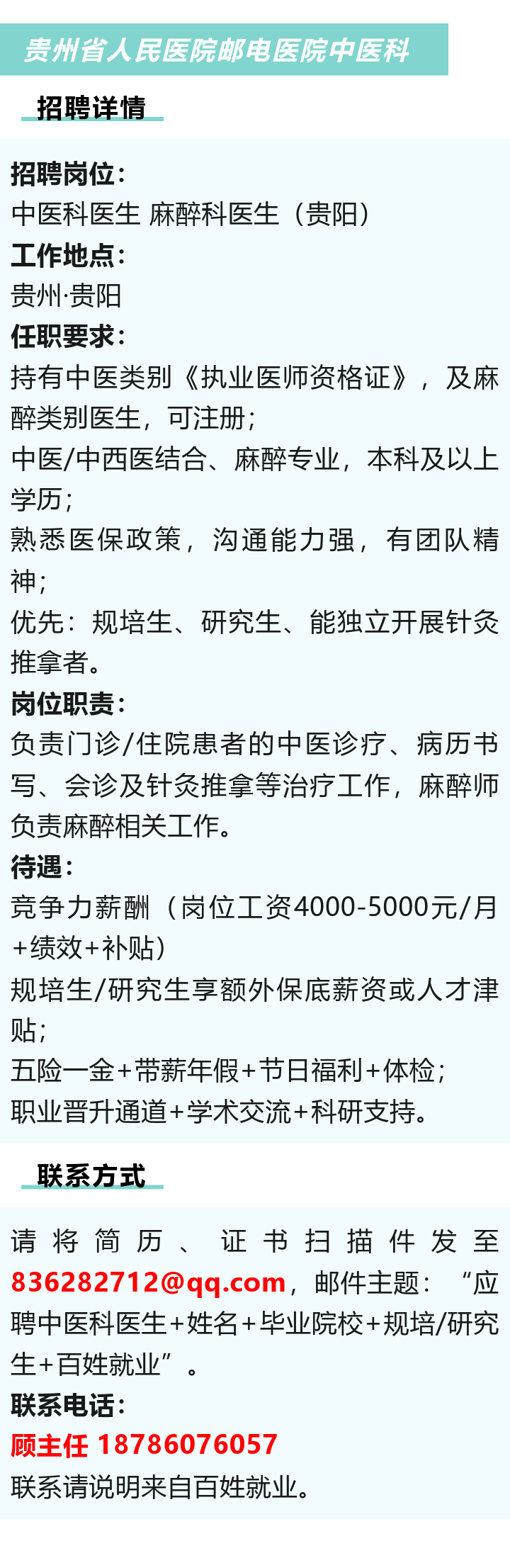 贵州省人民医院邮电医院中医科招聘!五险一金!