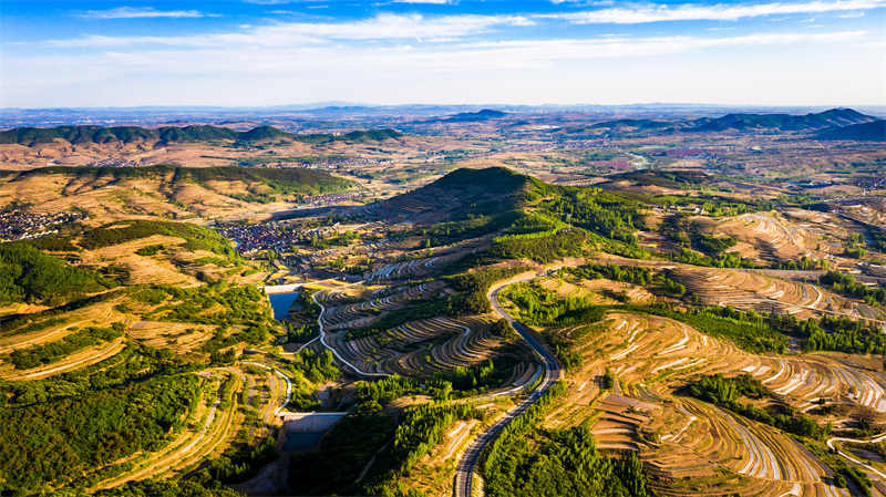 站在山上远眺,美景一览无遗,错落有致的梯田,随着山势的上升,呈现出不同的颜色,放眼望去,宛若大地的“调色盘“,勾勒出山东日照五莲县美丽乡村的“醉”美曲线。(刘颖婕 王军)