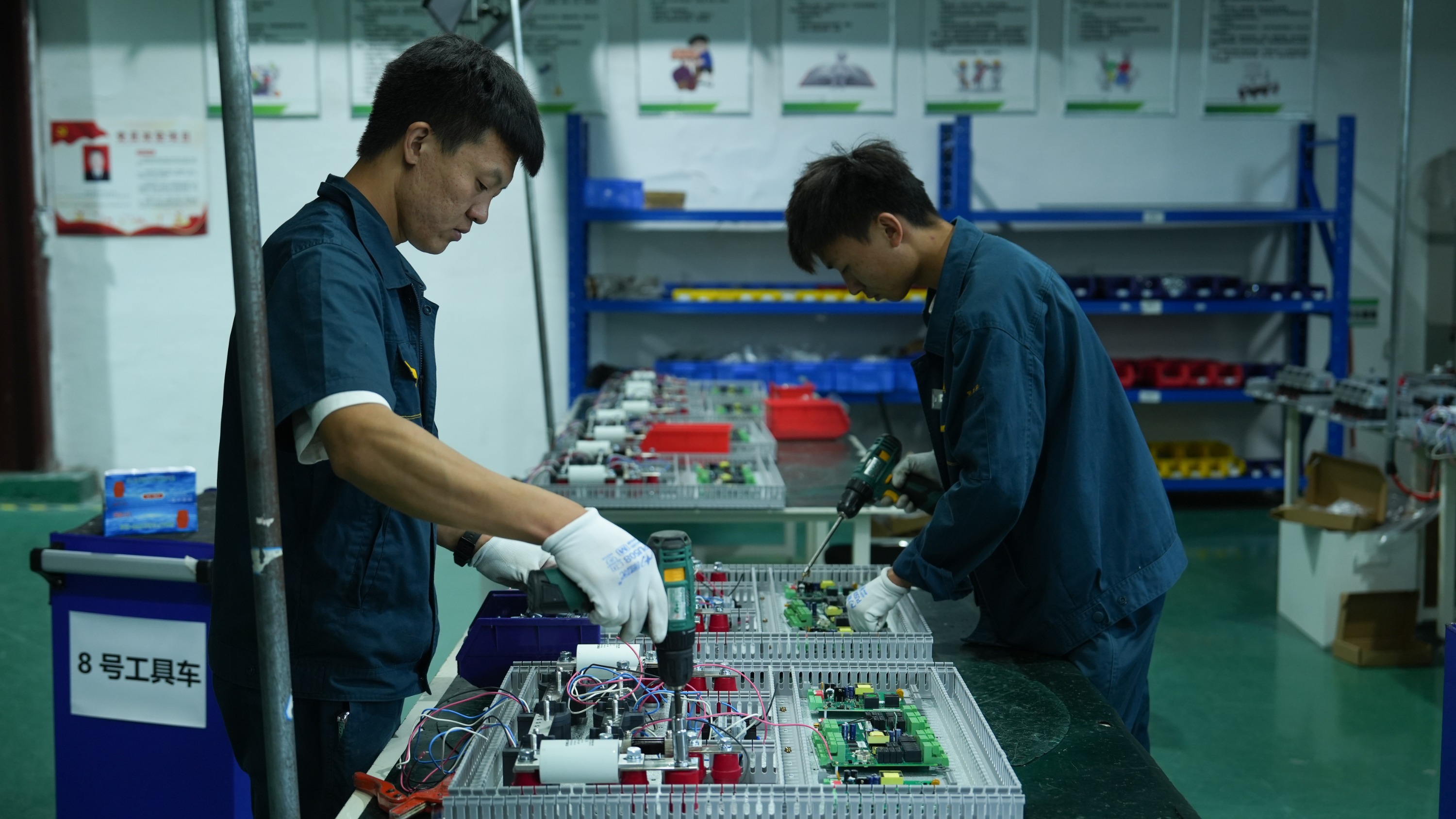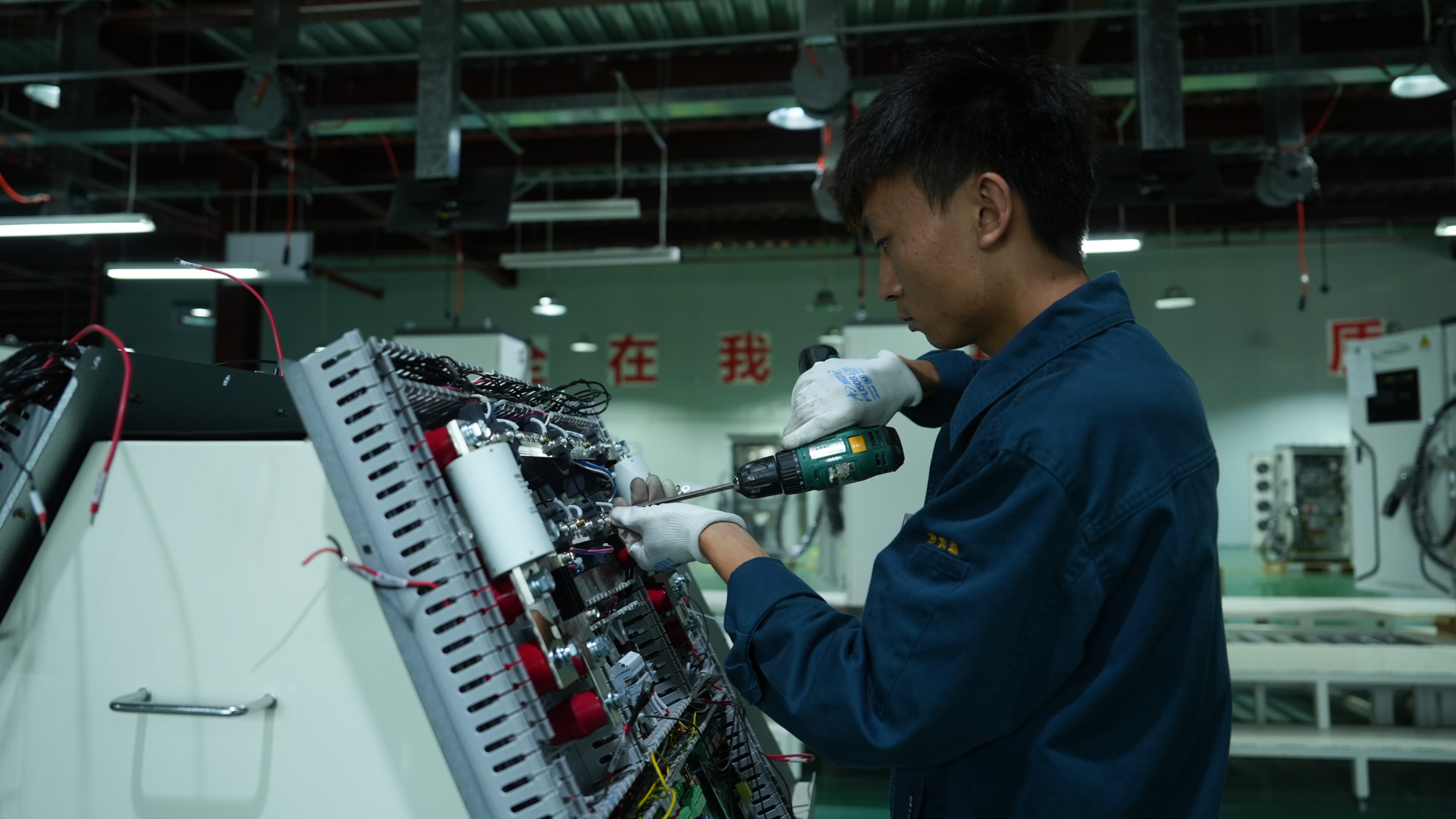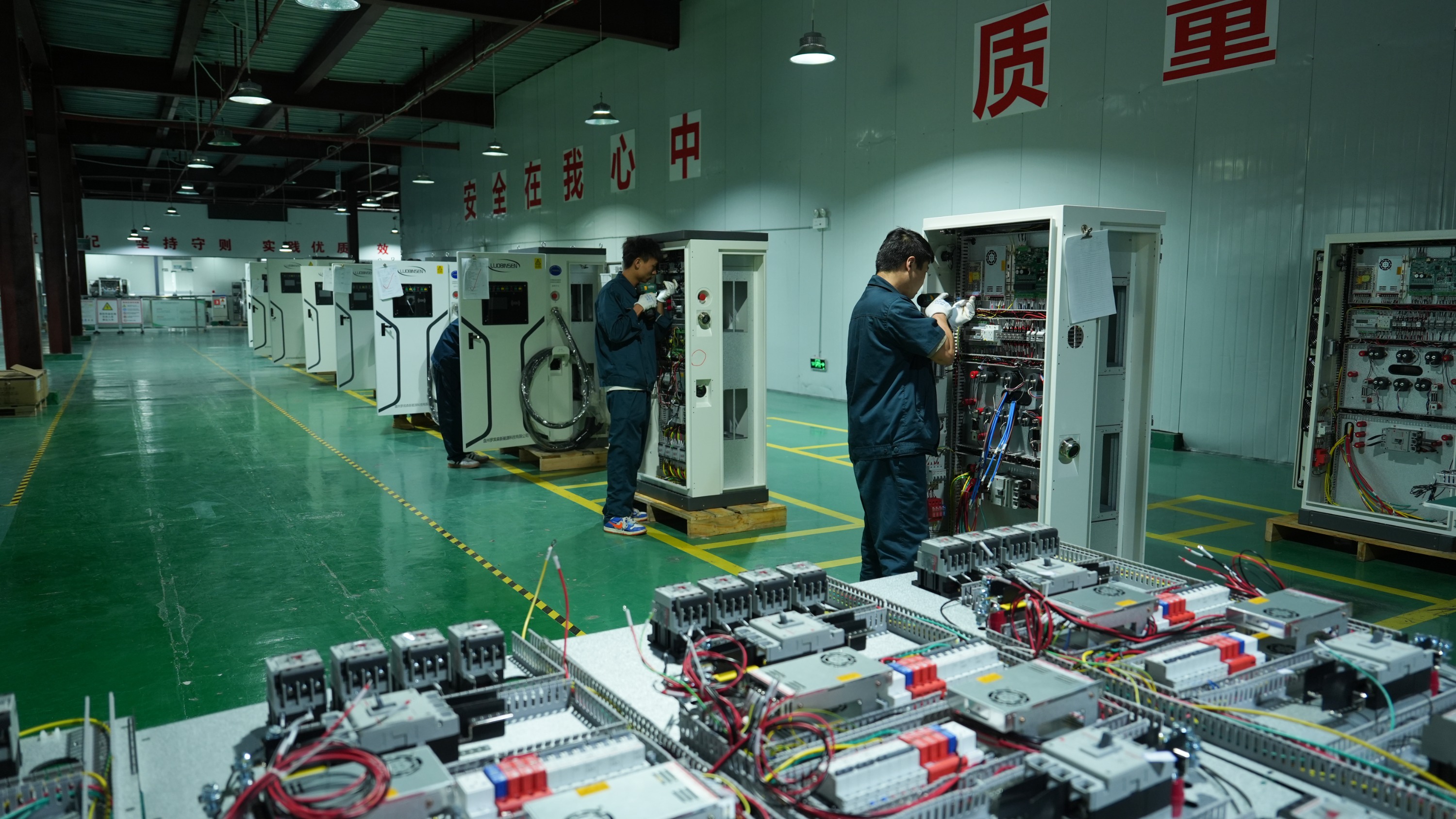 在公司生产车间里,工人们正在忙碌安装充电桩。为确保高质量完成今年8000万元的产值目标,公司加强与大连罗宾森电源设备有限公司在产品研发技术方面的合作,现在正在研发生产一台输出更智能、安全性高、能更灵活的适用于各类充电场站环境的640KW1拖12智能充电堆。