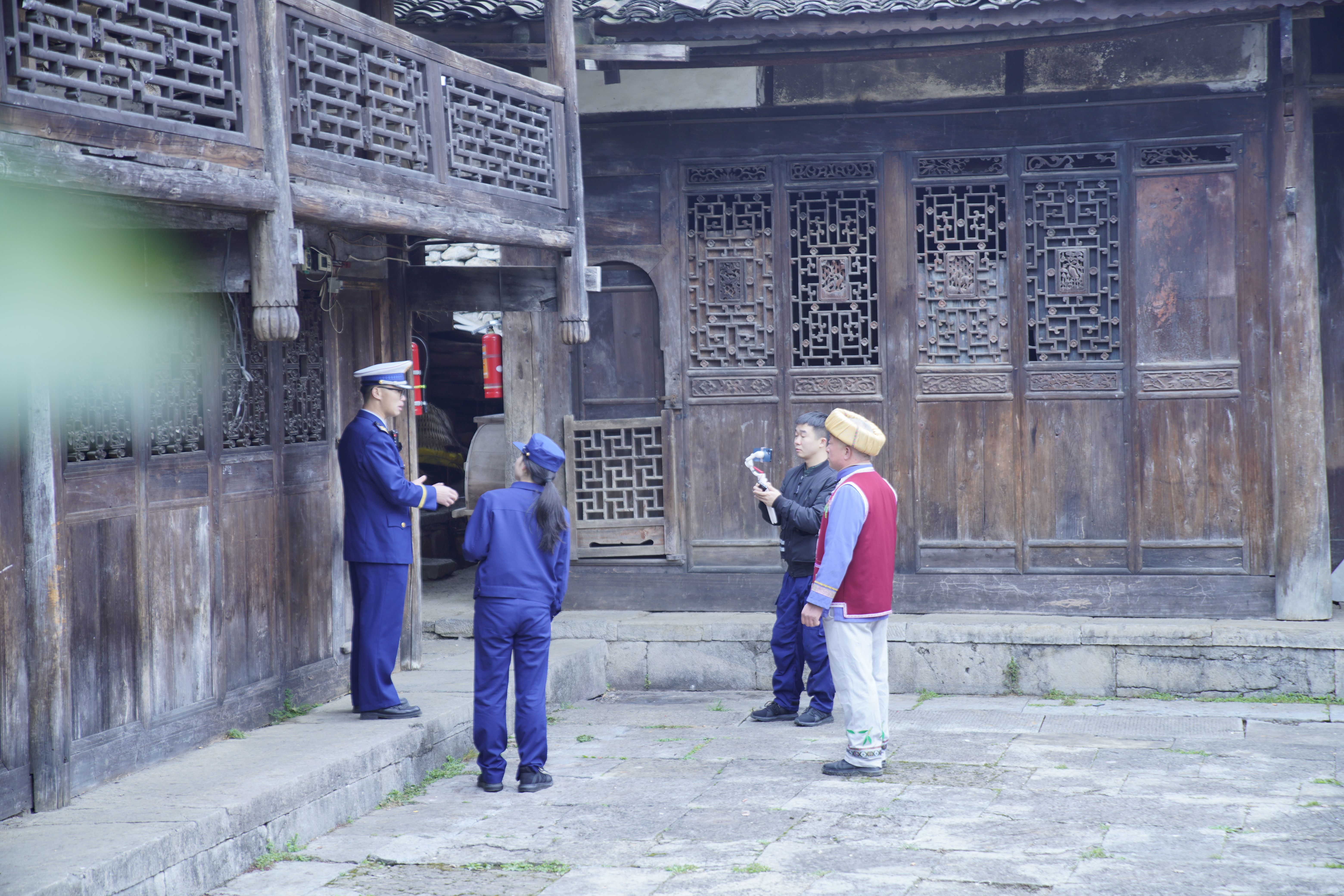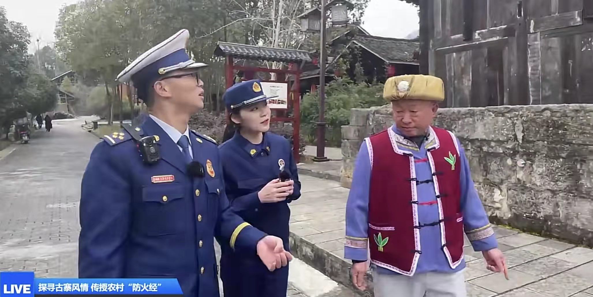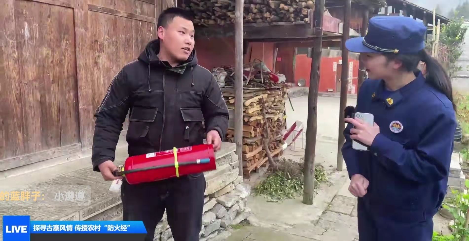 “大哥,天冷了,您家怎么取暖?炭火不充分燃烧会引发一氧化中毒,千万不要在卧室使用炭火!”“大爷,柴火不要堆在灶门口,容易引发火灾!”......当天活动现场,遵义消防的两位宣传员和当地德高望重的寨老一起准时开播,穿梭于古寨幽深的石巷,宣传员们用精妙的语言和恰到好处的镜头向网友们展示了“农村电气火灾探测器、火灾视频监控大数据平台、古老的消防水渠”,说明了古建筑防火、民俗驿站安全用气用电、消防产品使用等安全知识和灭火技能。身穿仡佬族传统服饰的寨老或沉思、或回忆着古寨中的木质防弹门、福禄寿喜平安木质雕花窗、明代高官申佑祠堂......古寨的一砖一瓦仿佛穿过时间的长河回到最初的模样。接地气的消防知识、神秘的仡佬文化更是吸引了广大网友的热烈讨论和积极点赞,直播间的气氛好不热闹。