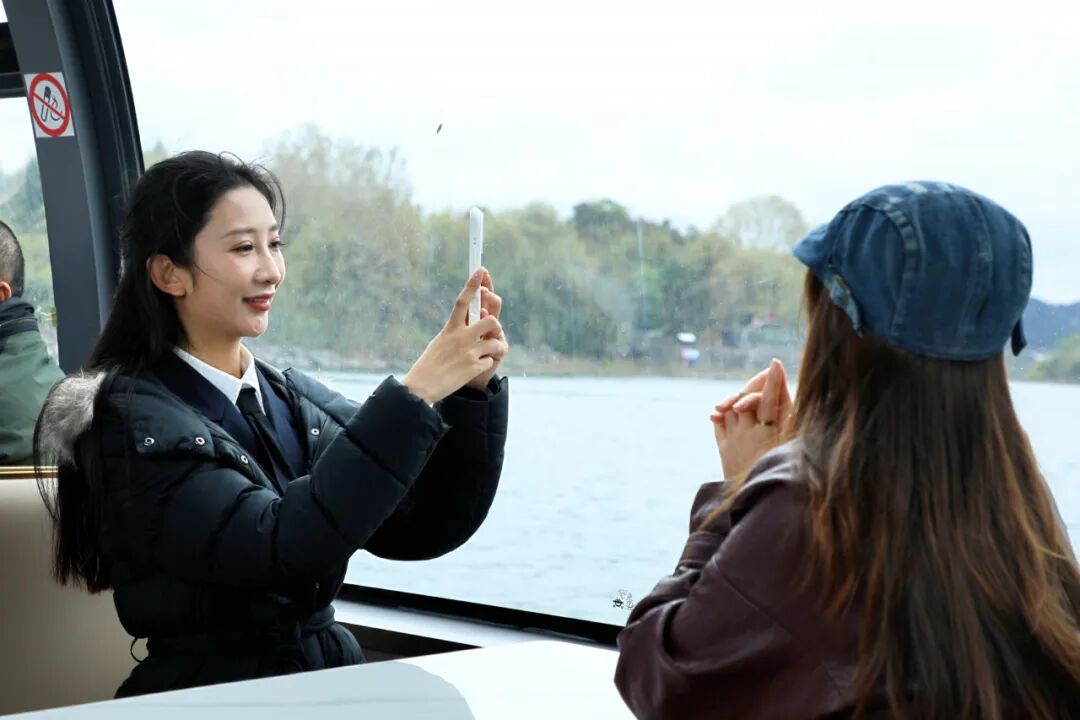 最后一站,博主们来到百花湖游船码头,乘船游览百花湖风光。雨后的百花湖雾霭氤氲、碧波荡漾,湖光山色与沿岸错落有致的民宿集群相映成趣,构成一幅绝美的生态山水画卷。乘船途中,大家纷纷拿起镜头记录沿途景致,详细了解百花湖生态保护、休闲旅游产品打造等相关情况。