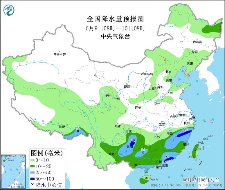 6月以来南方延续多雨格局,强降雨主要出现在贵州到江南一带,局地雨量大。昨天,随着冷空气进一步南推,强降雨带转移到华南地区,监测显示,福建中南部、广东、广西东部和南部、海南岛东北部及云南中部等地部分地区出现大雨或暴雨,江西赣州、福建龙岩和泉州、广东深圳和清远、广西南宁和贺州及云南普洱等局地大暴雨,广东惠州和汕尾局地特大暴雨(250~351毫米);上述地区最大小时降雨量有30~70毫米,广东揭阳局地108毫米。