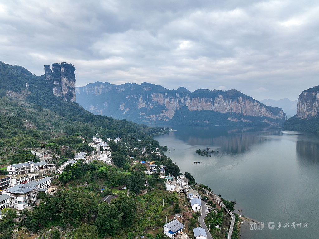清晨的乌江源百里画廊,薄雾如轻纱笼罩碧绿江面。游客可乘船穿行,或从直升机、滑翔伞上俯瞰喀斯特奇峰。岸边,“花都里”等数十家民宿依山而建,与田园生态画卷相映成趣。