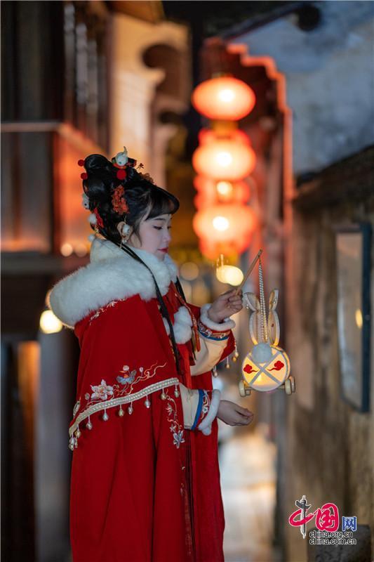 着一身红色罗裙,去贞丰十二坊、快闪萌兔年货市集里挑一把油纸伞、买一盏兔子灯,走在群青的暮色之中,灯影幢幢。