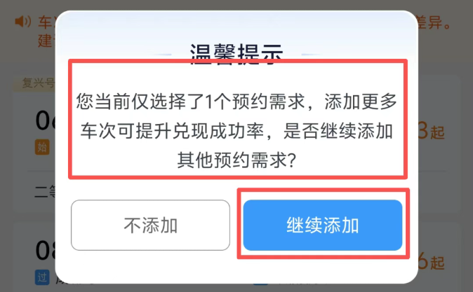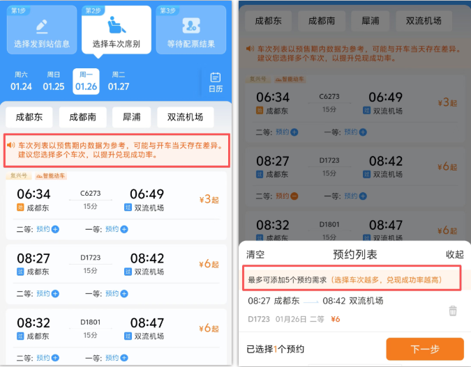 输入发到站后,页面会显示可选车次,请注意,同一用户最多可提交3个待兑现的预约订单,每个订单可提交1个乘车日期的5个“车次+席别”的组合,一笔订单最多可添加19名学生旅客且必须包含用户本人。