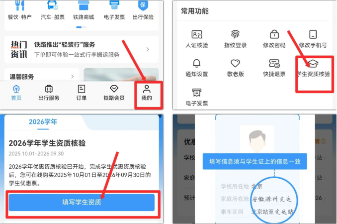 打开铁路12306App,点击“我的”,找到“学生资质核验”专区,按提示完成核验即可。优惠区间院校所在地与学信网信息一致即可,家庭居住地可根据实际情况随时调整。
