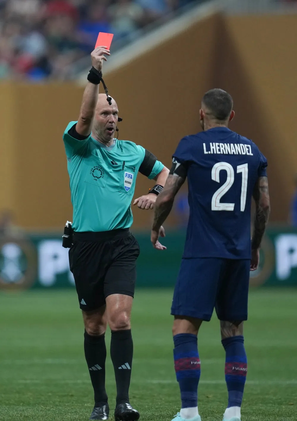 7月5日,主裁判安东尼·泰勒(左)向巴黎圣日耳曼队球员卢卡斯·埃尔南德斯出示红牌。新华社记者 黄宗治 摄