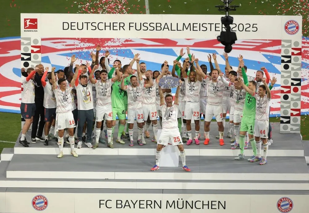 2025年5月10日,穆勒(前中)在颁奖仪式上高举奖杯与队友庆祝拜仁慕尼黑队取得历史上第33个德甲冠军。新华社发(菲利普·鲁伊兹摄)