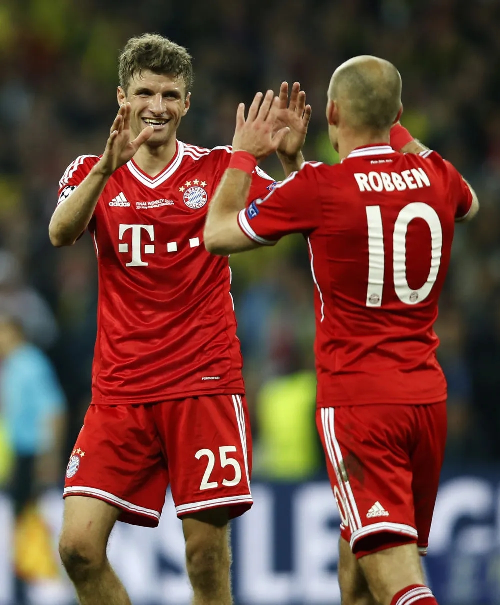 2013年5月25日,拜仁在2012-2013赛季欧冠联赛决赛中2:1战胜另一支德甲球队多特蒙德,夺得冠军。这是穆勒第一次跟随拜仁拿到欧冠冠军。图为穆勒(左)祝贺罗本进球。新华社记者 王丽莉 摄