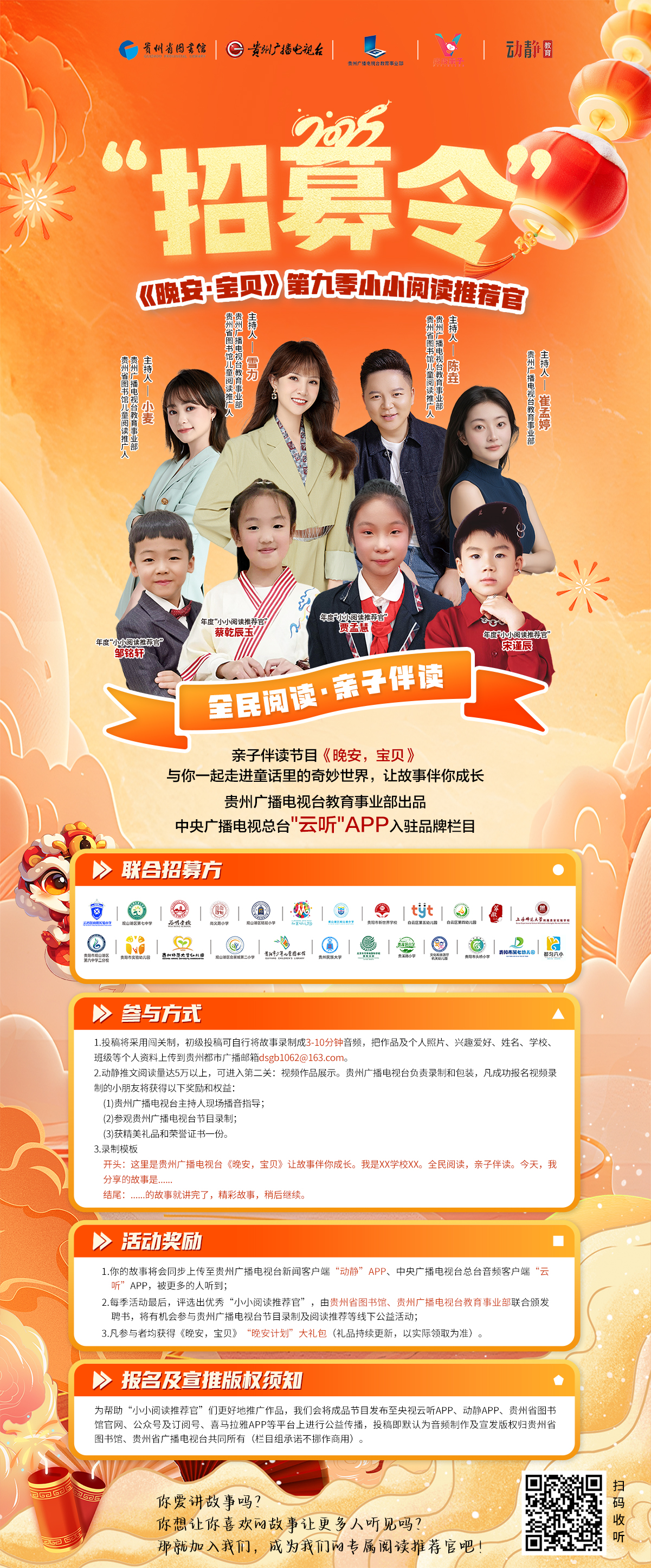 (5)每季活动最后,参加《晚安,宝贝》“小小阅读推荐官”聘书颁发仪式,由贵州省图书馆、贵州广播电视台教育事业部(GTV-6)联合颁发聘书,将有机会参与贵州广播电视台线下阅读公益活动,获得更多展示机会和荣誉。
