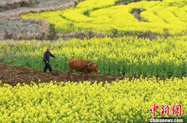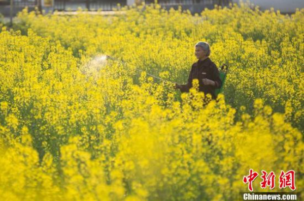 村民在油菜花田间劳作。
