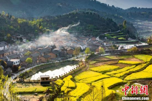 近日,位于大别山革命老区的河南新县10万亩油菜花竞相盛开。漫山遍野的油菜花或沿梯田,或依山水,构成了一幅幅美丽的山水田园画卷。图为古村前油菜花开。