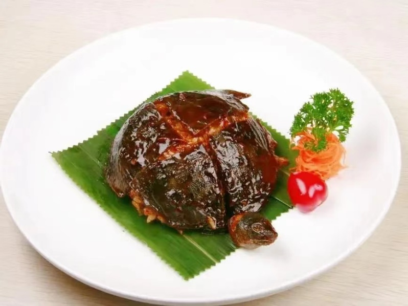 贵州名菜,选用优质甲鱼,配置卤水先炖煮熟透,然后将瑶柱、火腿、糯米,薏仁、芡实、笋、香菇等八种食材烹饪熟后填满甲鱼的腹中,最后放上甲鱼壳,造型就像一只完整的甲鱼,吃起来味道鲜美,口感丰富且醇厚。