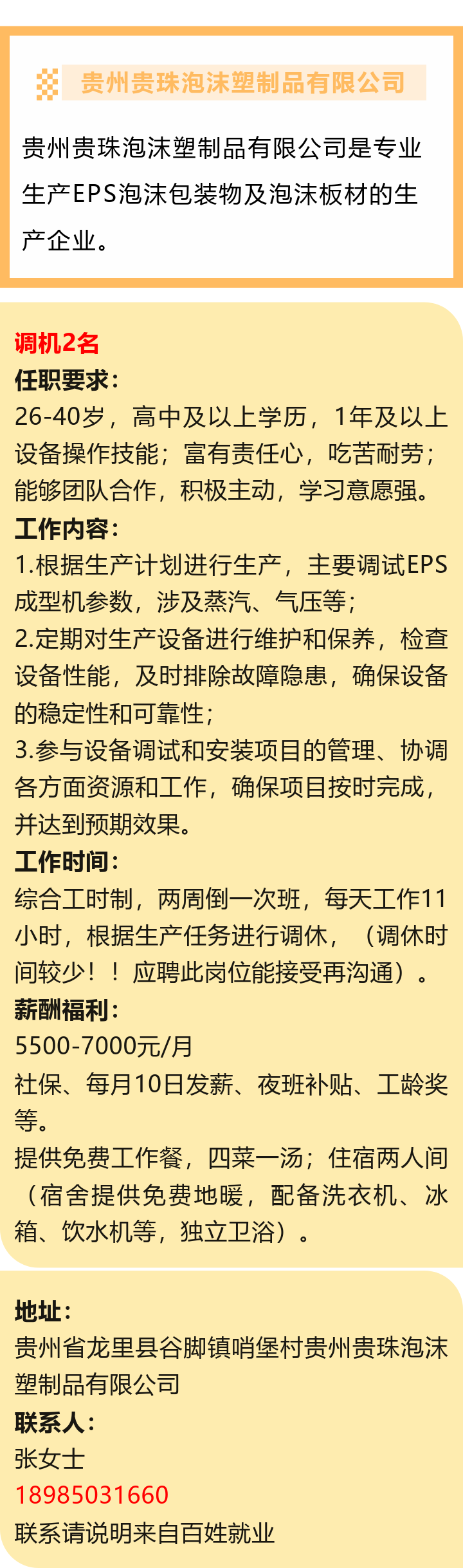 贵州贵珠泡沫塑制品有限公司招聘!月薪5500-7000元!提供免费工作餐!