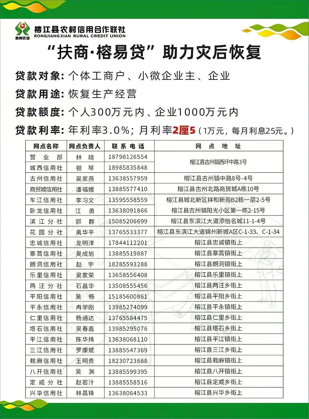 榕江县农村信用社对特大洪灾受灾企业、个体户、农户、居民,开辟绿色通道,低利率、简流程、立即贷,全力支持全县工商业复工复产、提振全县群众消费信心。