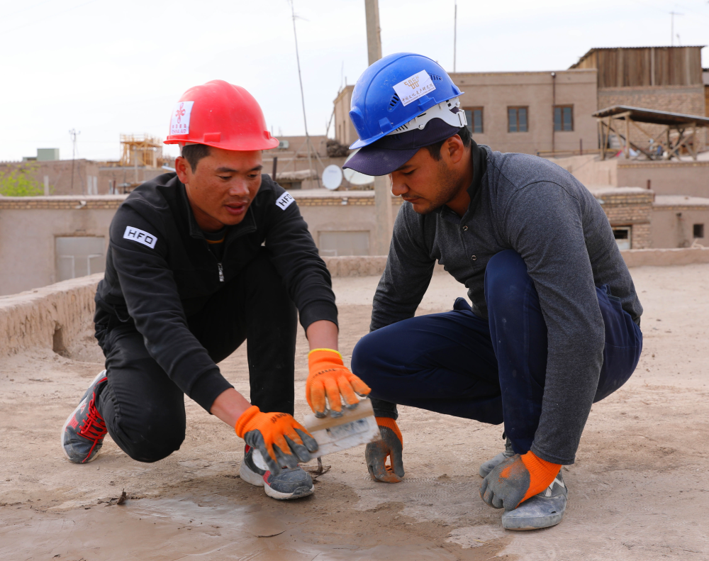 在乌兹别克斯坦希瓦古城哈桑·穆拉德库什别吉清真寺,中方文物修复人员指导乌方工作人员修复清真寺屋顶。