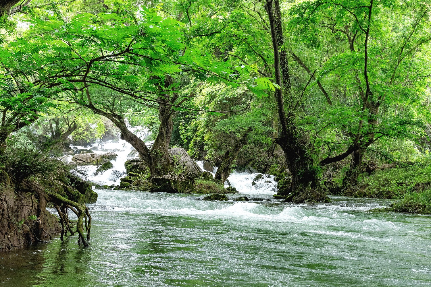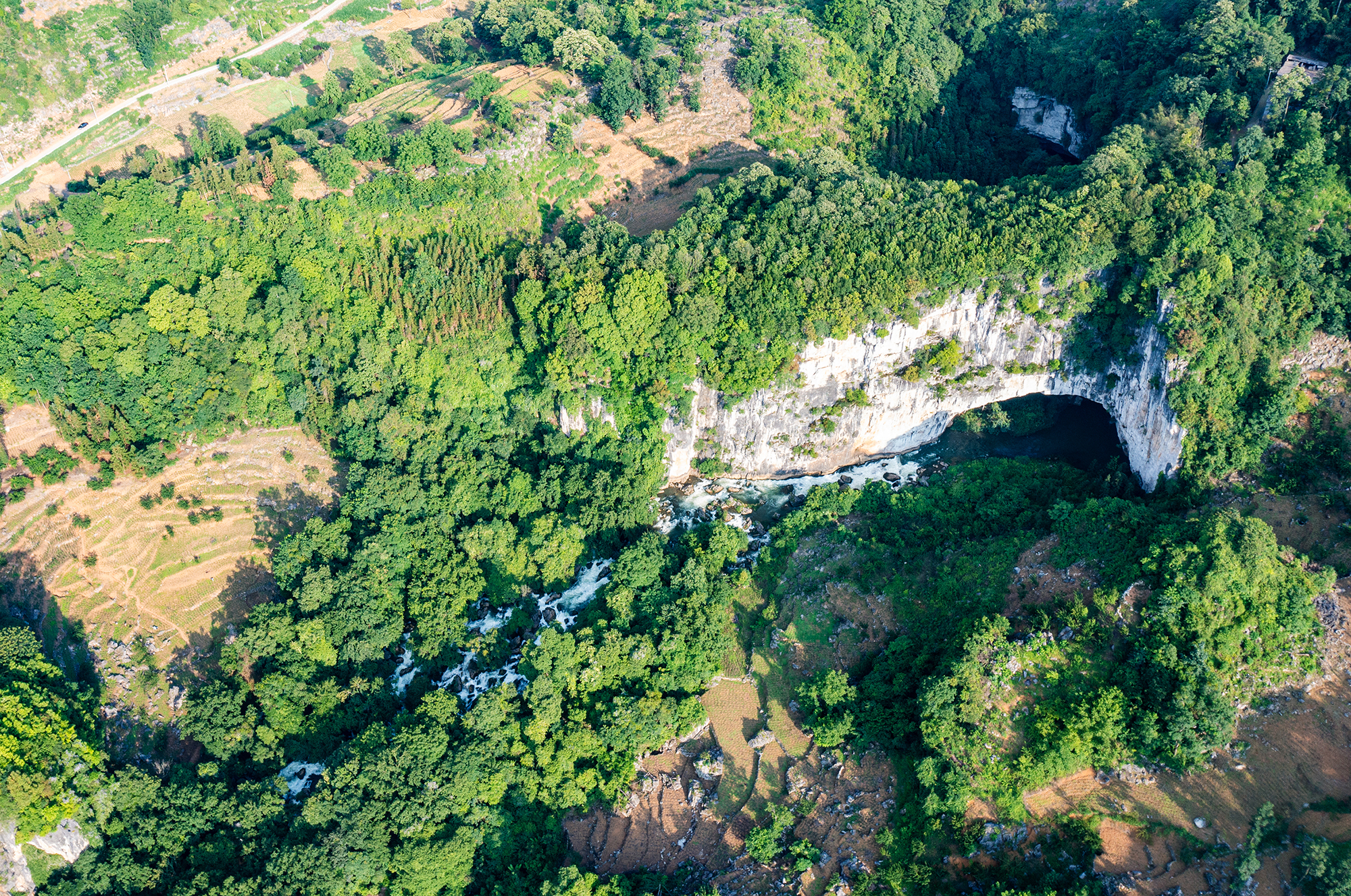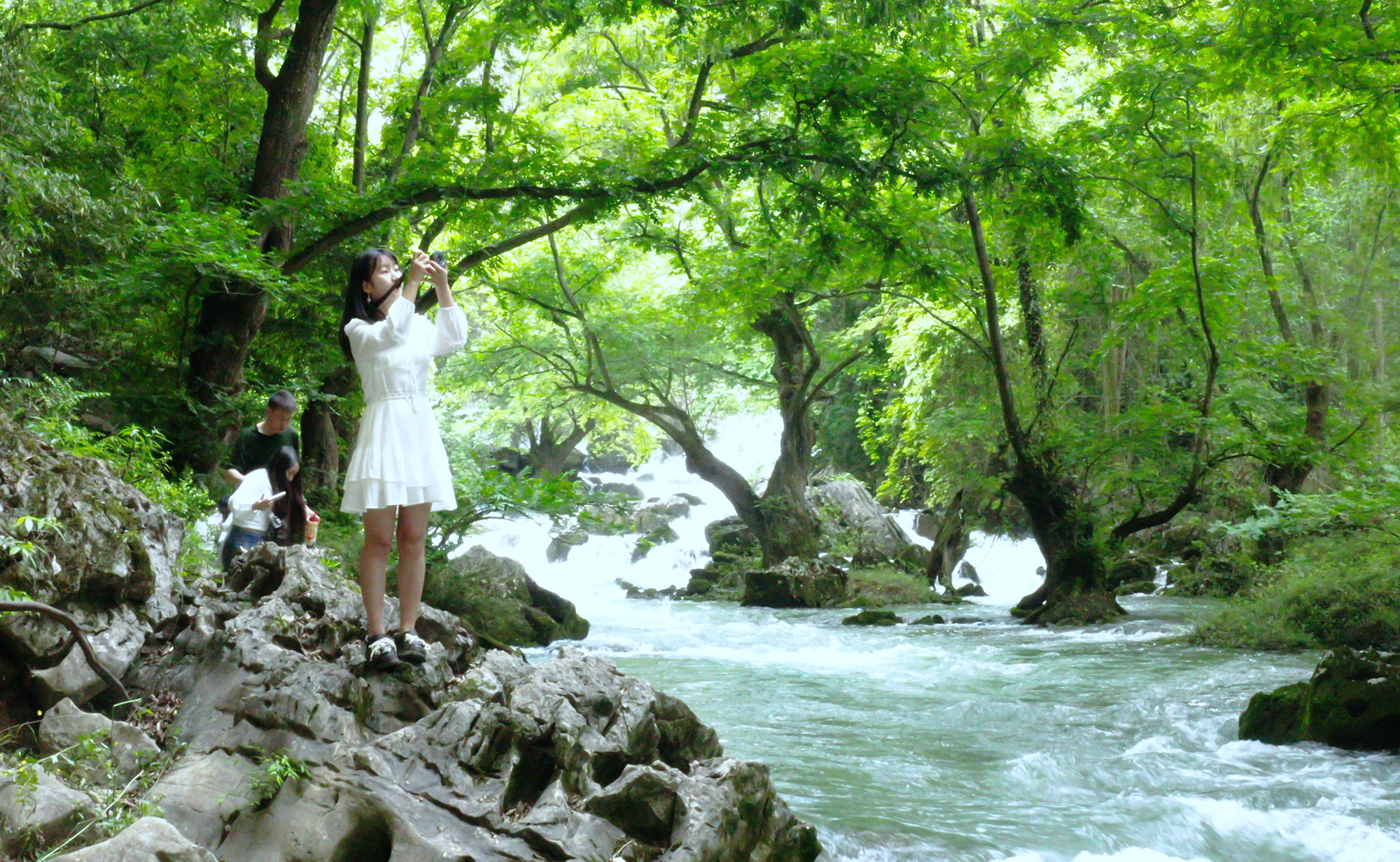 未开发的野生景点往往藏着最原始的美,“溶洞+伏流+天坑”的组合是大自然的神来之笔。河流流经天坑群底,时出时伏,若隐若现,大硝洞入口下方的明流河道,林荫下延绵百米的瀑布群穿山而过,是最容易到达的景点,也是最出片的地方,自然成为人们纳凉解暑、观景打卡的首选地儿。