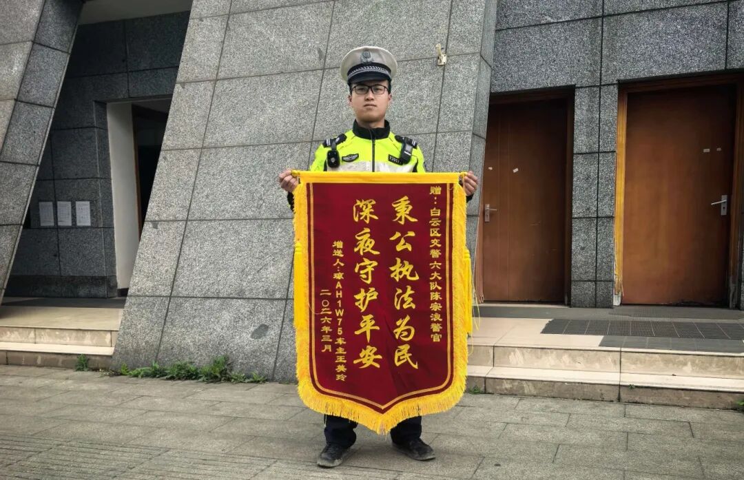 3月27日,王女士特意通过跑腿平台,将一面印着“深夜守护平安、秉公执法为民”的锦旗,送到了白云交警大队四中队,用最质朴、最真诚的方式,向暖心辅警陈宗浪致谢,也向贵阳这座温暖的城市表达谢意。