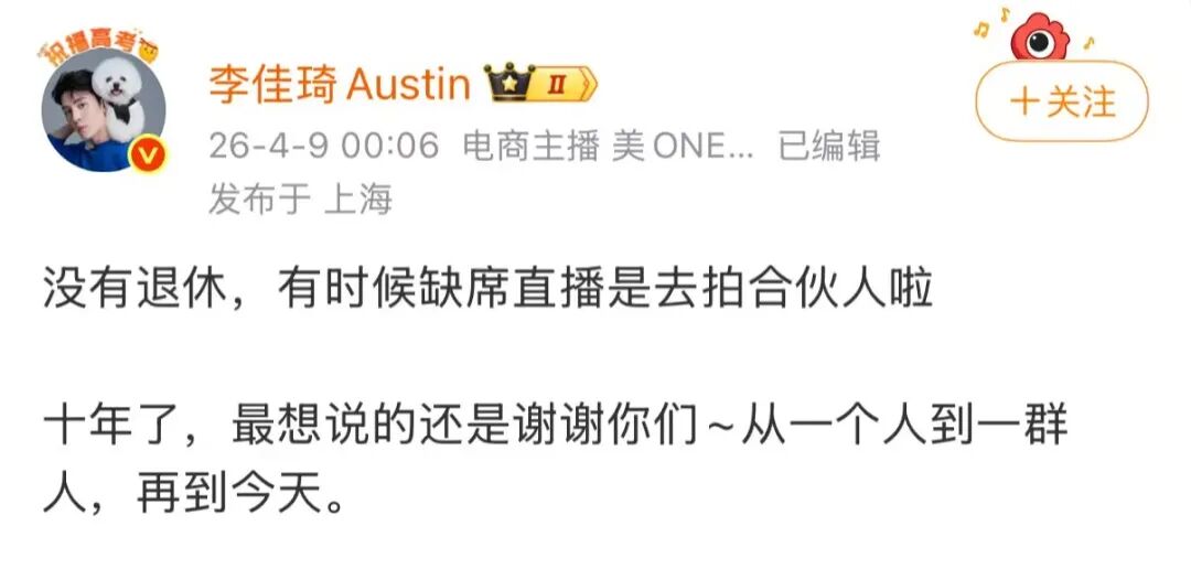4月9日0时6分,李佳琦郑重发文澄清:“没有退休,有时候缺席直播是去拍合伙人啦。”