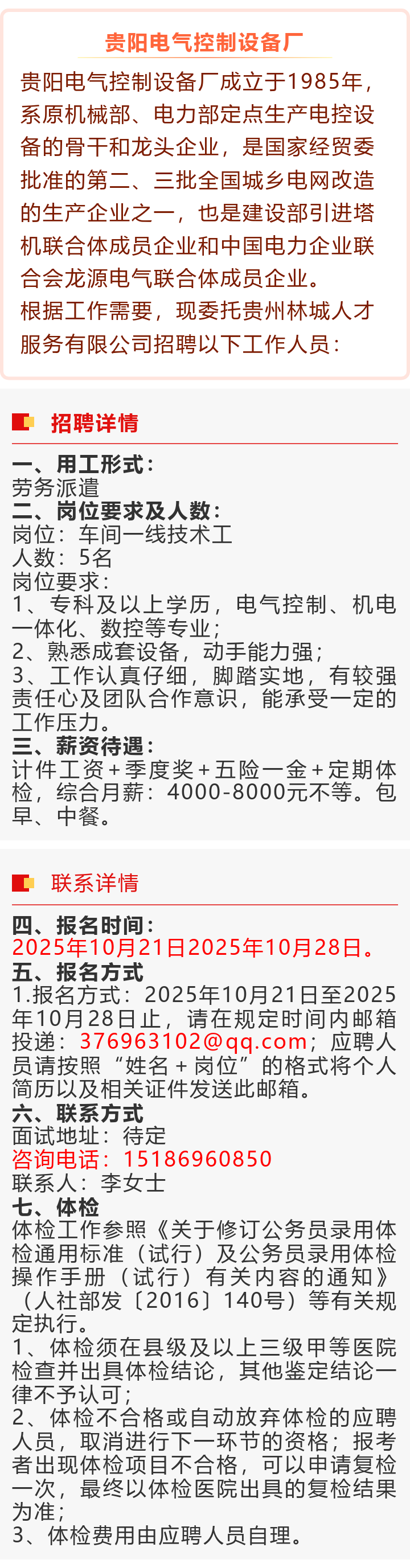 贵阳电气控制设备厂招聘车间一线技术工!综合月薪4000-8000元!