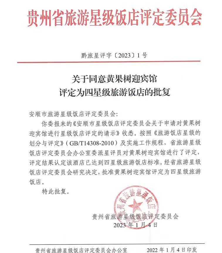据了解,省旅游星级饭店评定委员会在收到《安顺市星级饭店评定委员会关于申请对黄果树迎宾馆进行星级饭店评定的请示》后,按照《旅游饭店星级的划分与评定》(GB/T14308-2010)及实施工作规程,省旅游星级饭店评定委员会办公室委派星评员对黄果树迎宾馆进行了评定,评定结果认定该酒店已达到四星级旅游饭店标准。黄果树迎宾馆被评定为四星级旅游饭店,将进一步提升安顺市旅游接待服务质量和水平。