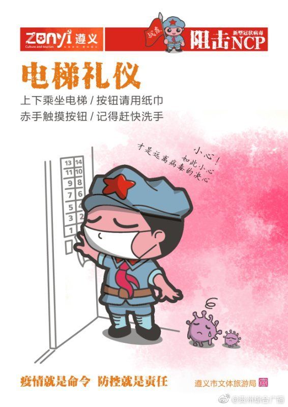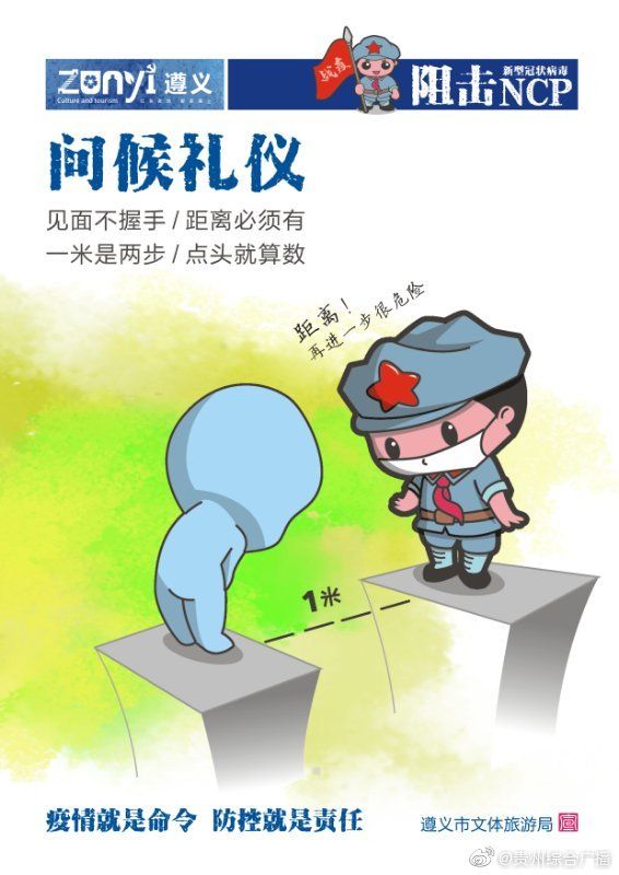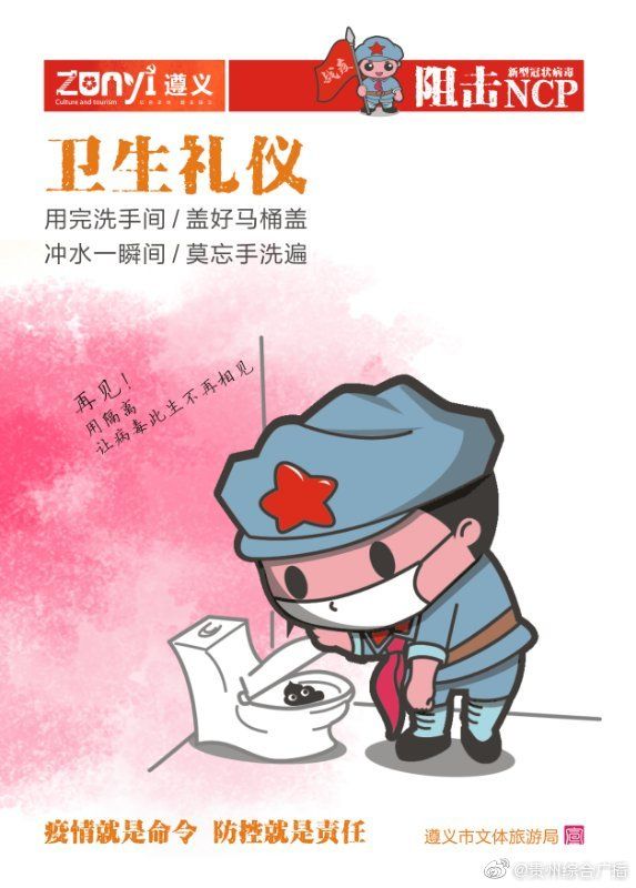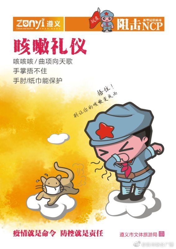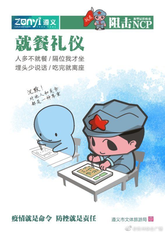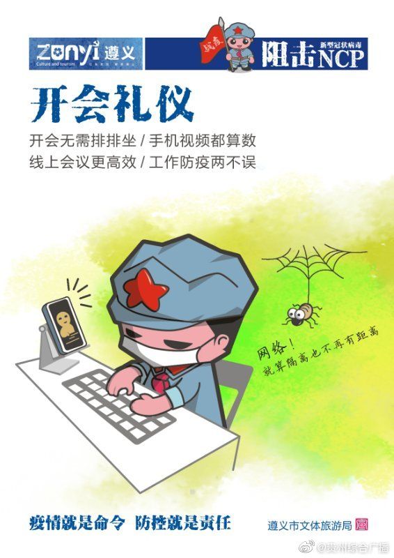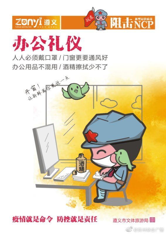 继全民战疫”卡通版防疫秘笈”宣传海报推出后,针对当前复工复产在即的情况,贵州省遵义市文体旅游局近日发布防疫工作礼仪海报 ,帮助广大机关干部职工做到防疫和业务工作两不误。