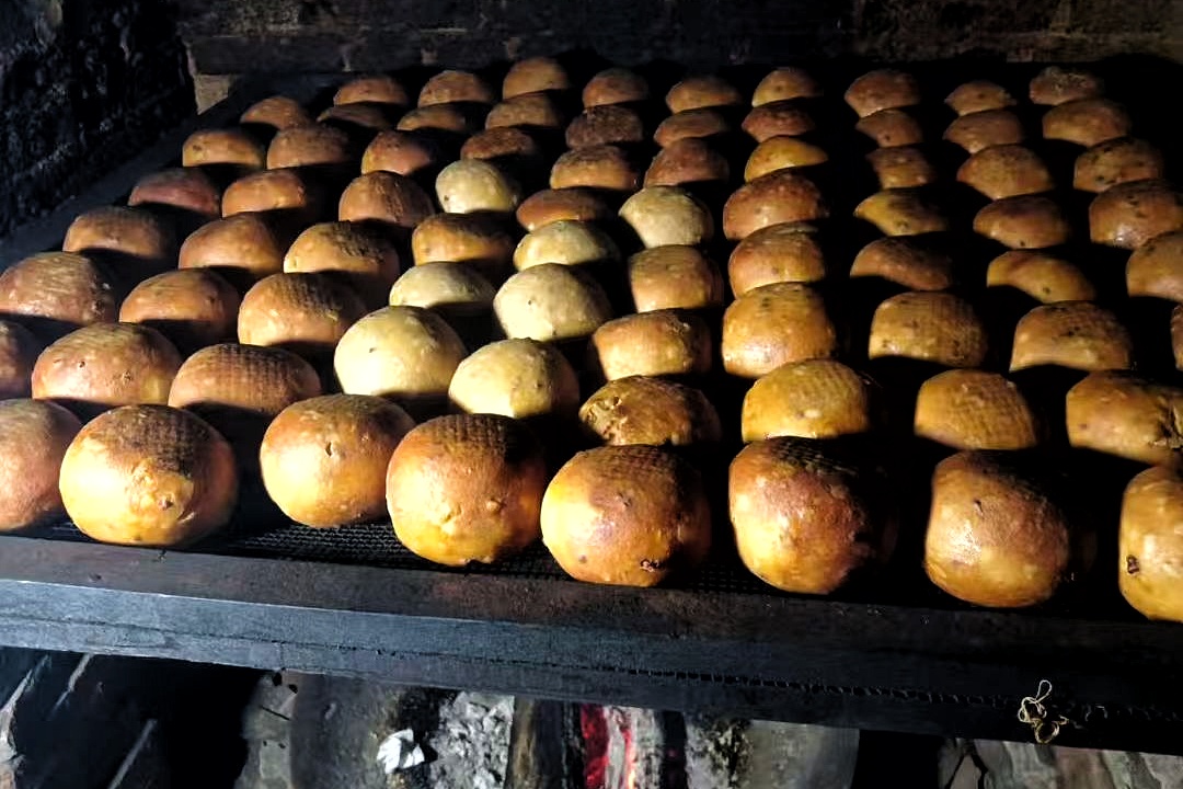 这个环节,家人都会参与。每人一个大勺子,在炭火上烤热,涂上一层肥肉熬出的油,再把蛋液倒进去摇匀加热,一块块圆圆的蛋皮就成形了。