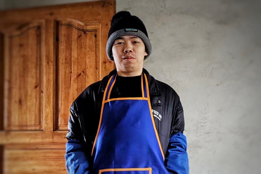杨秀军穿上围裙,准备干活