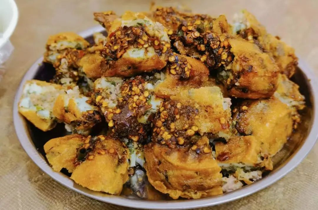 盒子粑又称为油炸鸡蛋糕,是贵州黔西南州兴仁的特色名小吃,它是用大米和黄豆为主要原料,配以猪肉、葱、胡椒粉、酱油、盐等辅料经过油炸制作而成。成品外壳金黄酥脆,内部软糯美味,油而不腻,咀嚼有味,馅心鲜嫩适口,咸淡适中,肉香、葱香、清甜各种美味在口中,久久不散,让人回味悠长。