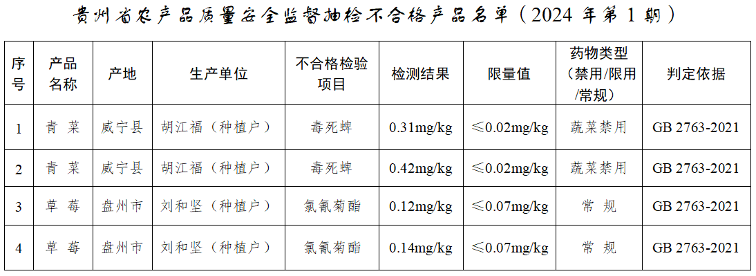 贵州省农业农村厅关于4批次农产品不合格情况的公告