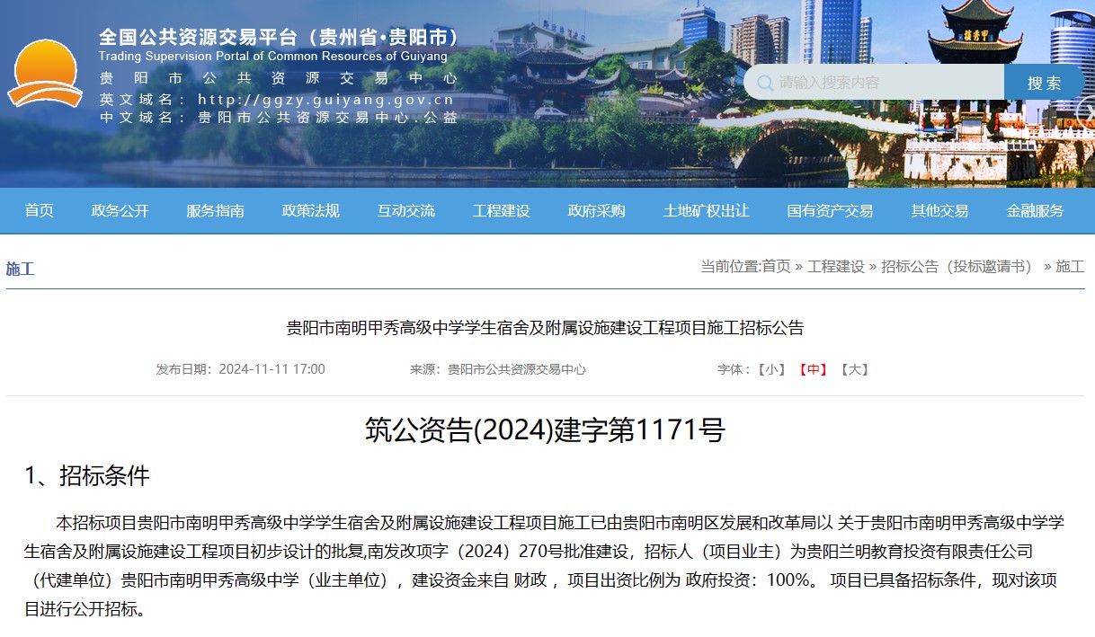 11月11日,贵阳市公共资源交易中心官网发布贵阳市南明甲秀高级中学学生宿舍及附属设施建设工程项目施工招标公告。