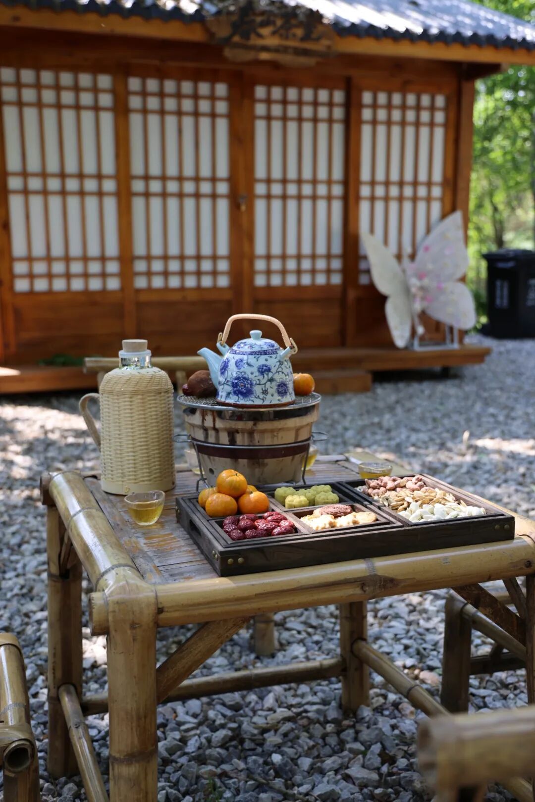 游客在杜鹃湖茶室围炉煮茶、打卡拍照