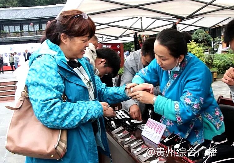 “我们带的银饰系列产品有戒指、项链、耳环之类的,全部都是手工制作的。”国家级非遗传承人吴水根苗族银饰的代表吴春秀这次特意带了上百件银饰产品参加活动,她对这种文旅融合促消费的模式非常赞同,吴春秀说:“织金洞景区的游客比较多嘛,我们也希望能让更多外地的朋友了解苗族银饰。现在网络平台很方便,有些游客现场加了我们的微信,后期会购买,还有一些合作的,我觉得这种方式挺好的。”