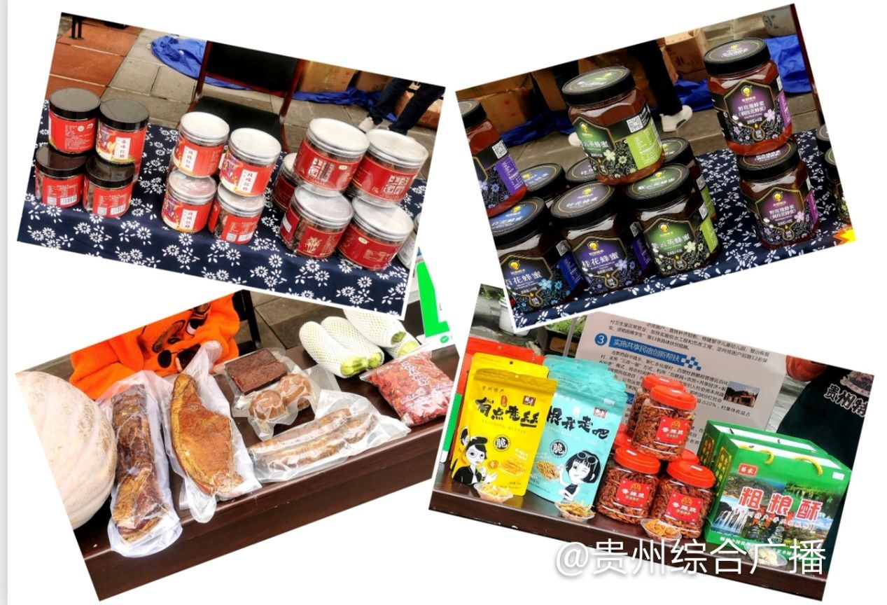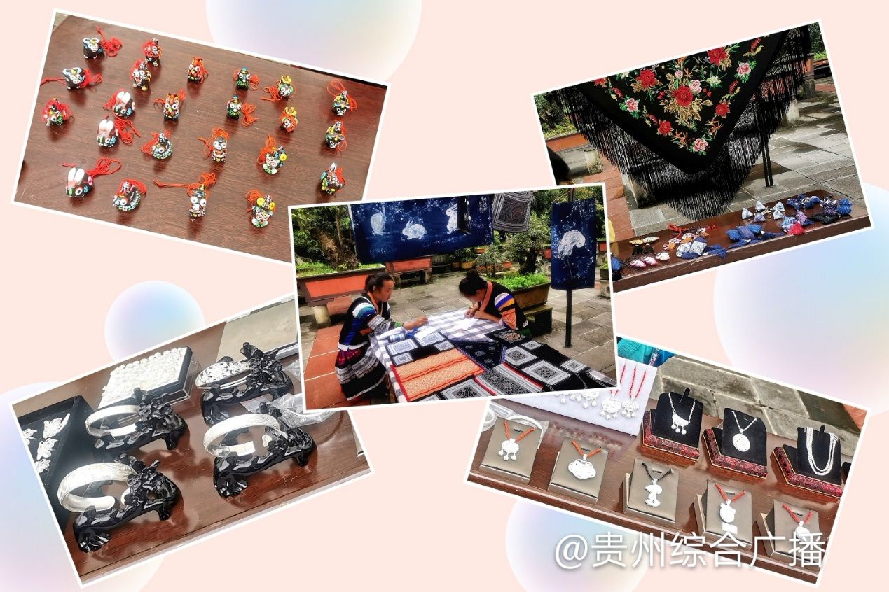除了精彩的非遗节目展演外,现场还有六盘水蜡染、黄平泥哨、松桃苗绣、湄潭黑茶、苗族银饰等非遗手工技艺品和夜郎蜂蜜、土方红糖、空心面等农特产品展示展销,织金洞旅游公司也设置了旅游扶贫农特产品展销点,摆出了织金当地的香肠、腊肉、香辣脆、粗粮酥等产品。