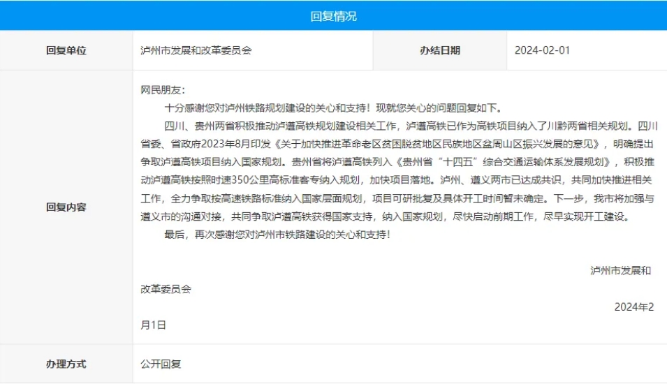 我市将积极争取省发展改革委会同四川省发展改革委共同争取国家发展改革委、国铁集团支持,将泸州至遵义铁路按高铁功能纳入国家《新时代中长期铁路网规划》及国家《“十五五”铁路发展规划》规划建设类项目,并争取项目尽早开工建设。