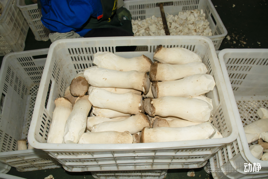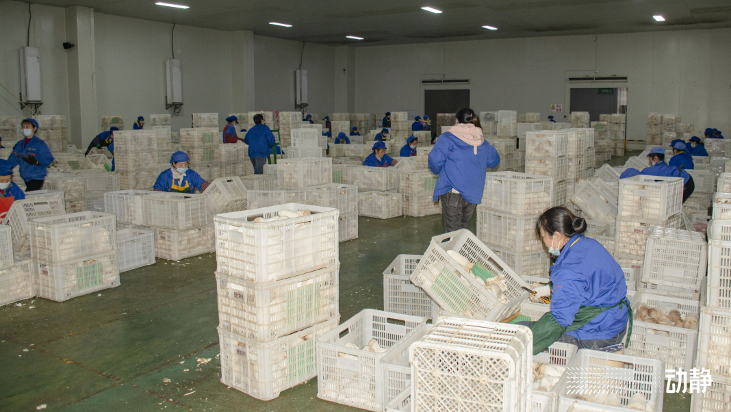 走出菌棚就进入了生产加工车间,这里200多名工人正在有条不紊地忙碌着,削菇、打包、装车、入库一气呵成。