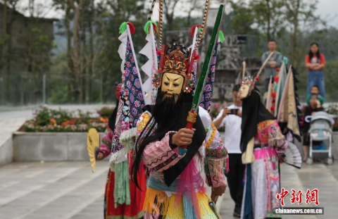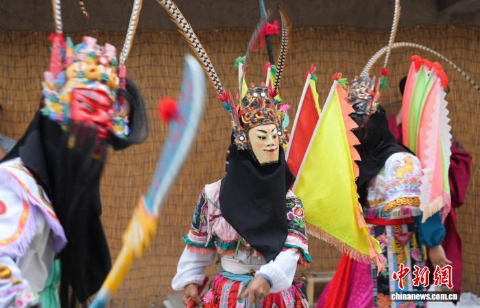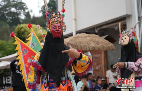图为安顺市西秀区旧州古镇的《三英战吕布》地戏表演。石小杰 摄