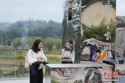 图为游客在安顺市西秀区旧州古镇观赏艺术装置《归乡·屯堡高台》。石小杰 摄