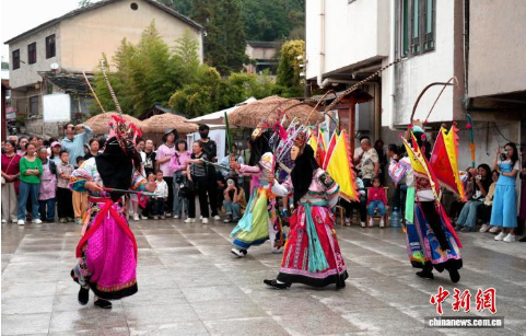 国庆中秋假期期间,贵州省安顺市西秀区旧州古镇凭借独特的屯堡文化和上千幅海内外摄影作品吸引了众多游客前来打卡游玩。旧州古镇拥有东、西、南、北四大街,这里青石巷陌蜿蜒,明清建筑林立,被誉为“黔中秘境”。9月27日至10月27日,2025多彩贵州·第十八届中国原生态国际摄影大展在旧州古镇举行,这场以影像艺术对话六百年屯堡文化的视觉盛宴在这里喜迎宾客,为这座“石头堡垒”更增添了几分光影的魅力,整个展览好似一场可游可感的沉浸式文化体验。图为安顺市西秀区旧州古镇的《三英战吕布》地戏表演。石小杰 摄