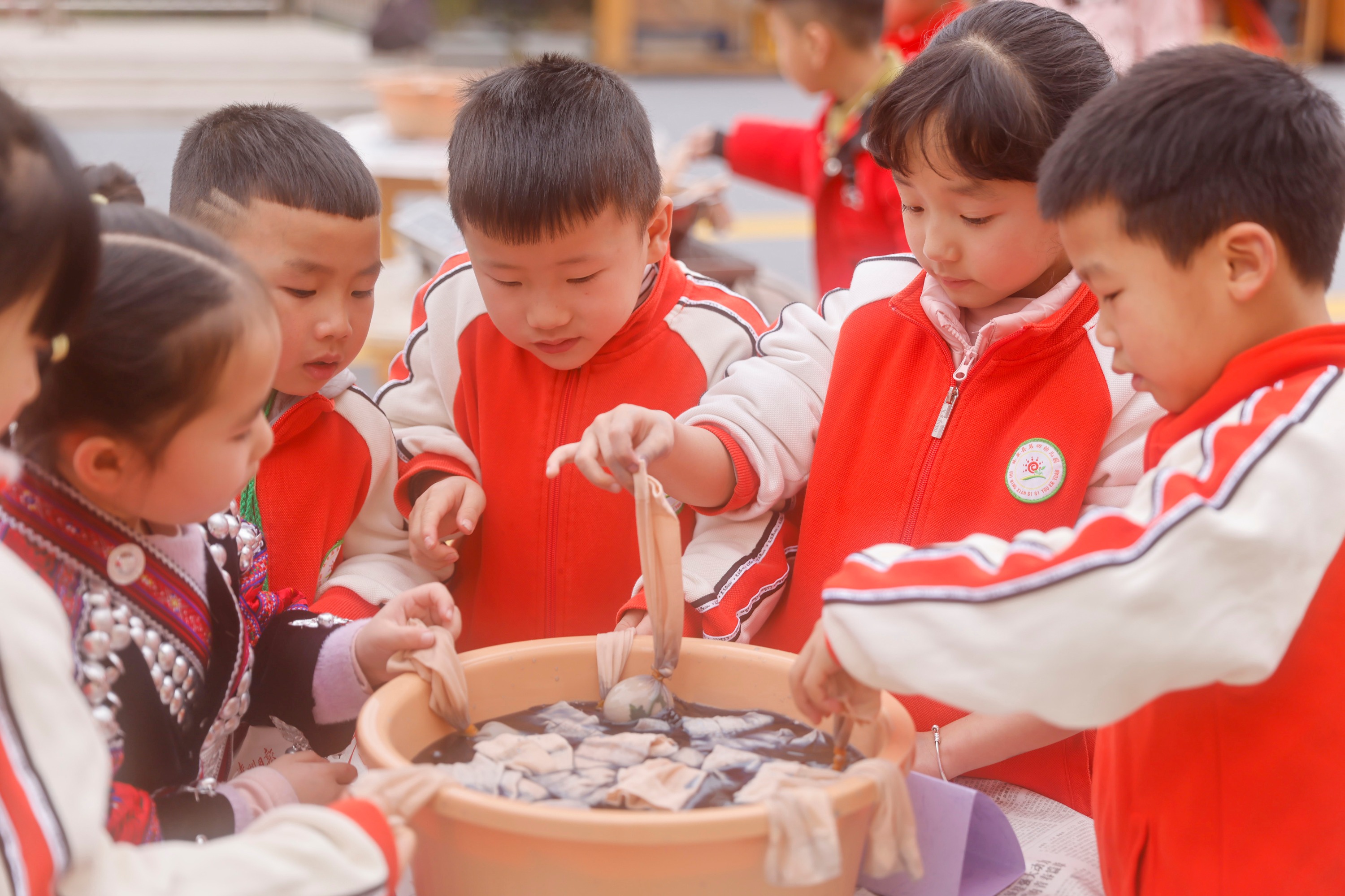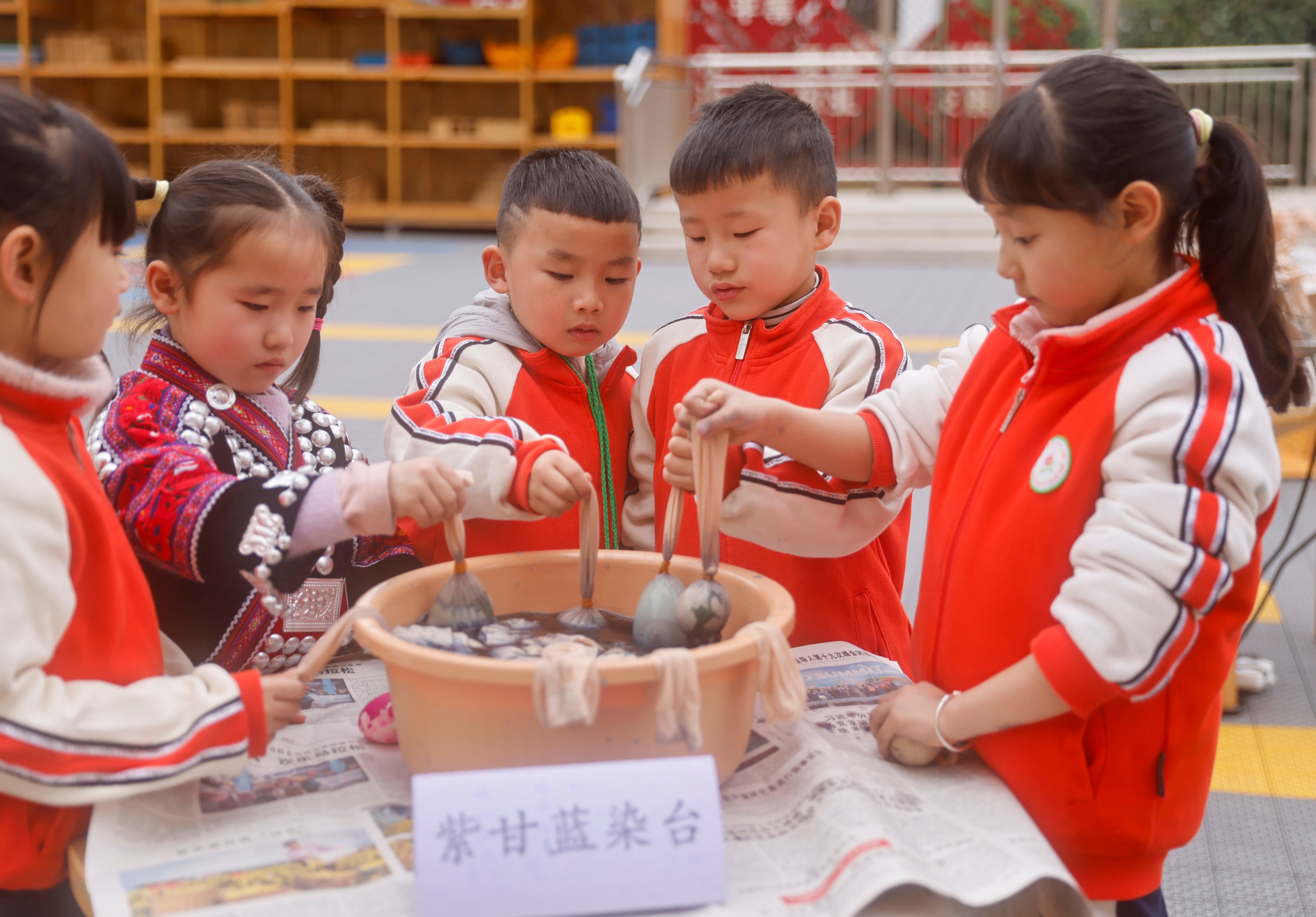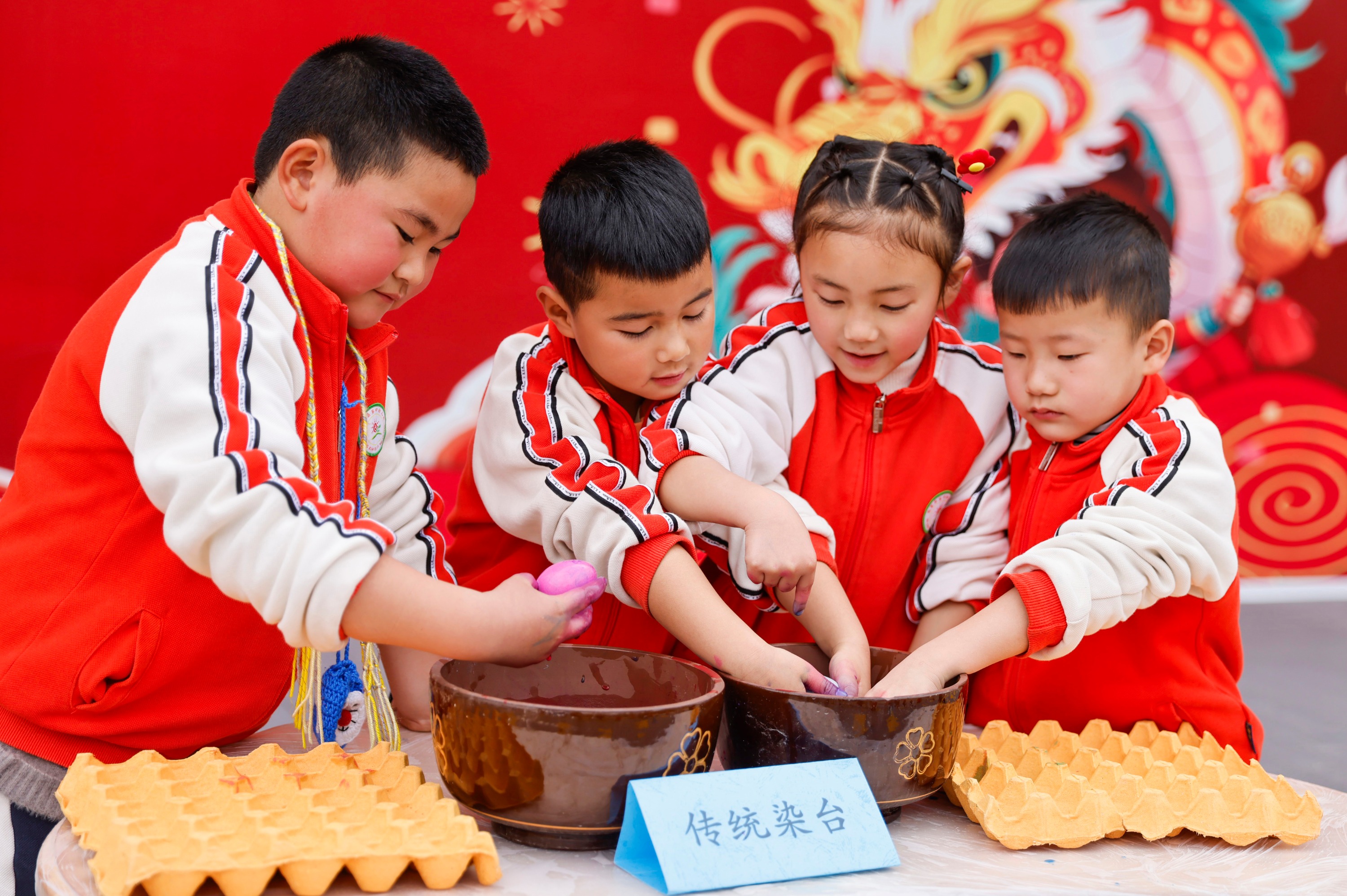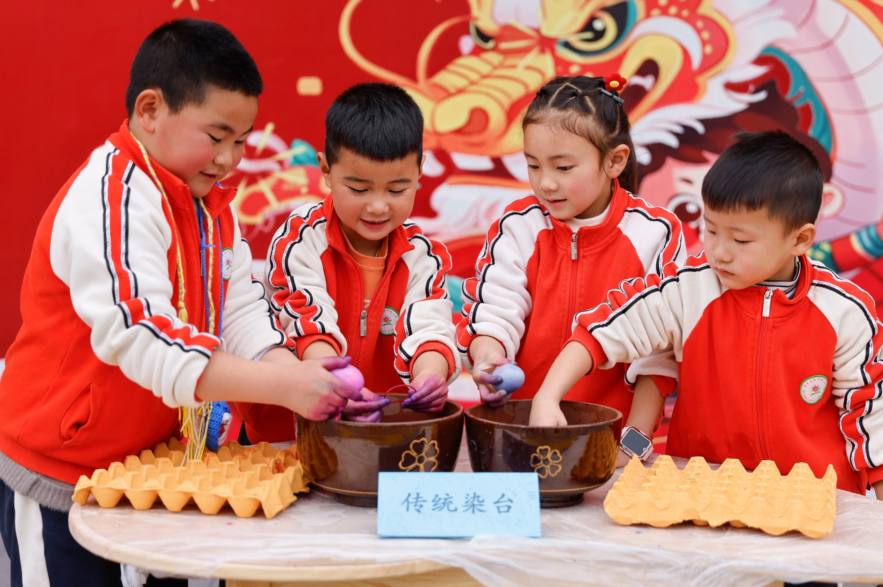 2025年2月28日,贵州省黔东南苗族侗族自治州施秉县第四幼儿园的小朋友在染蛋。(磨桂宾 摄)