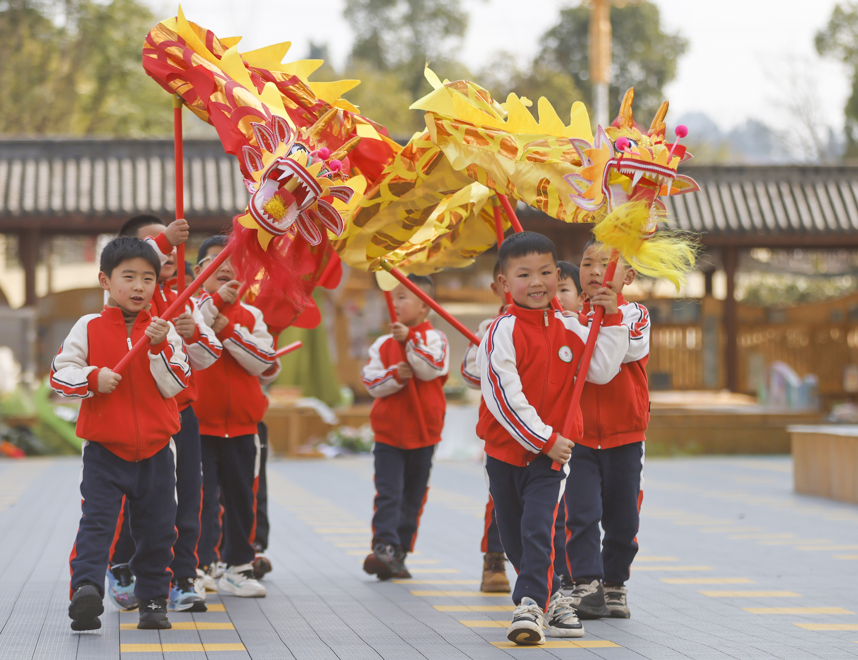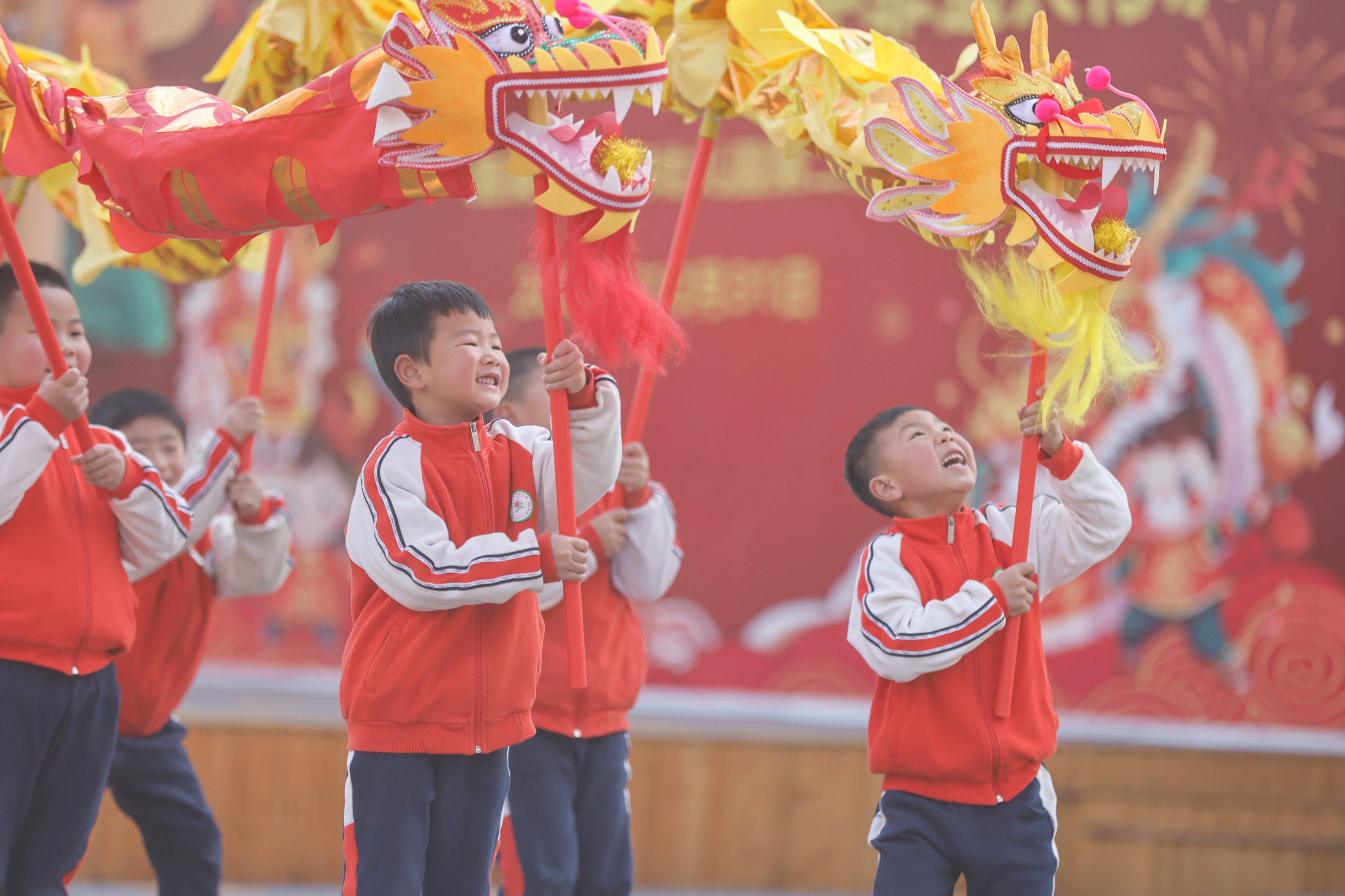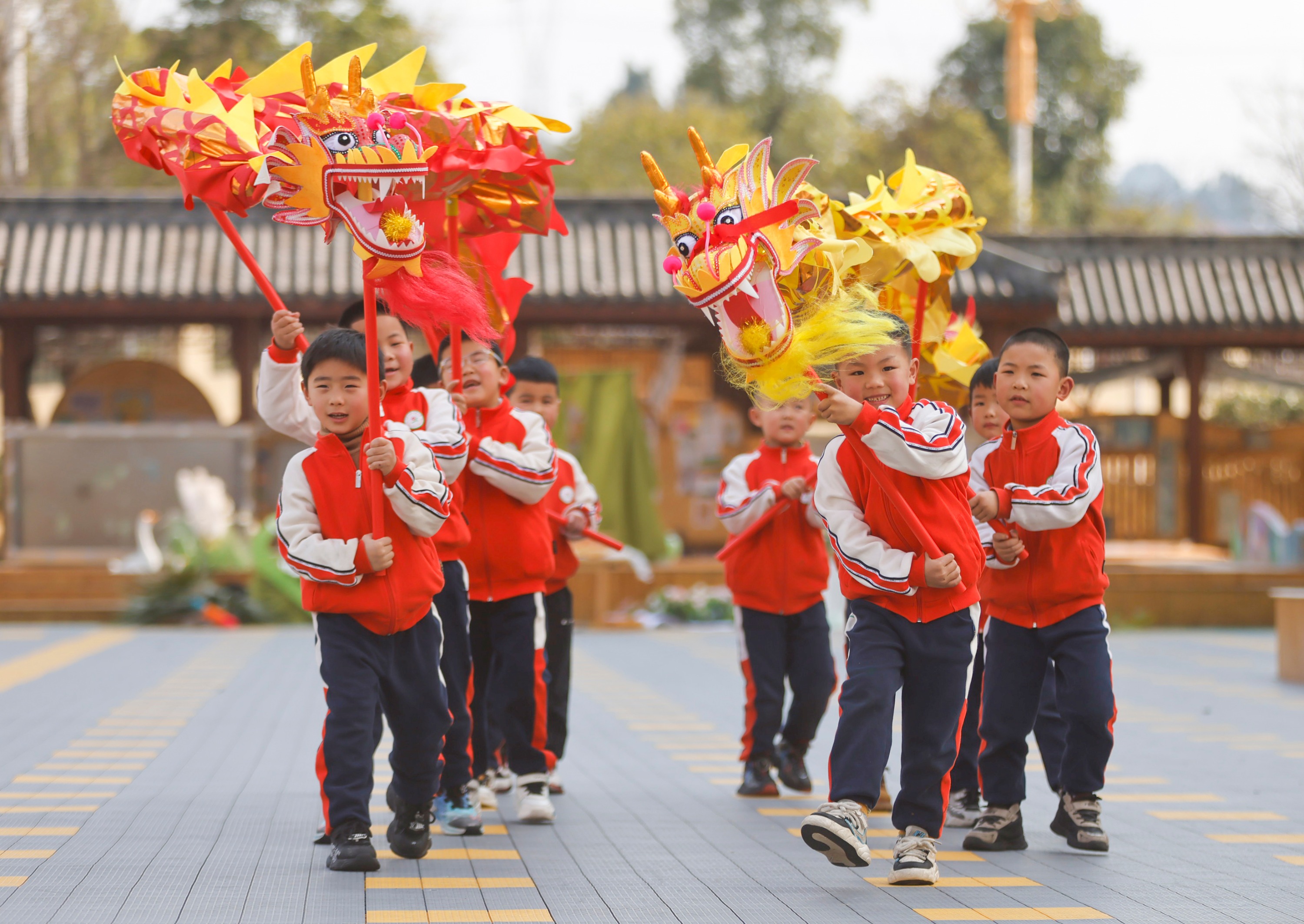2025年2月28日,贵州省黔东南苗族侗族自治州施秉县第四幼儿园的小朋友在舞龙。(磨桂宾 摄)